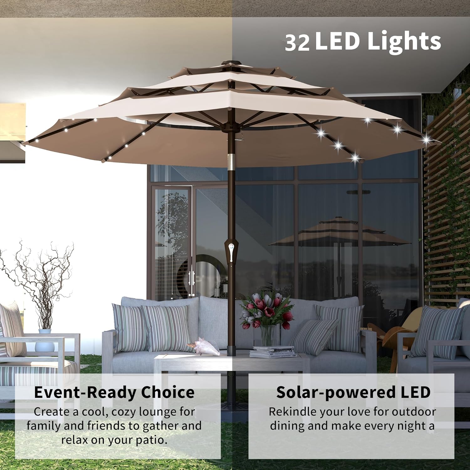 Kingdura 10ft 3-Tier Patio Umbrella with Solar Lights, Table Umbrella Outdoor Patio with Easy Crank & Tilt, 8 Sturdy Ribs, UV Protection, 32 LED Lights for Deck, Poolside, Market (Beige)