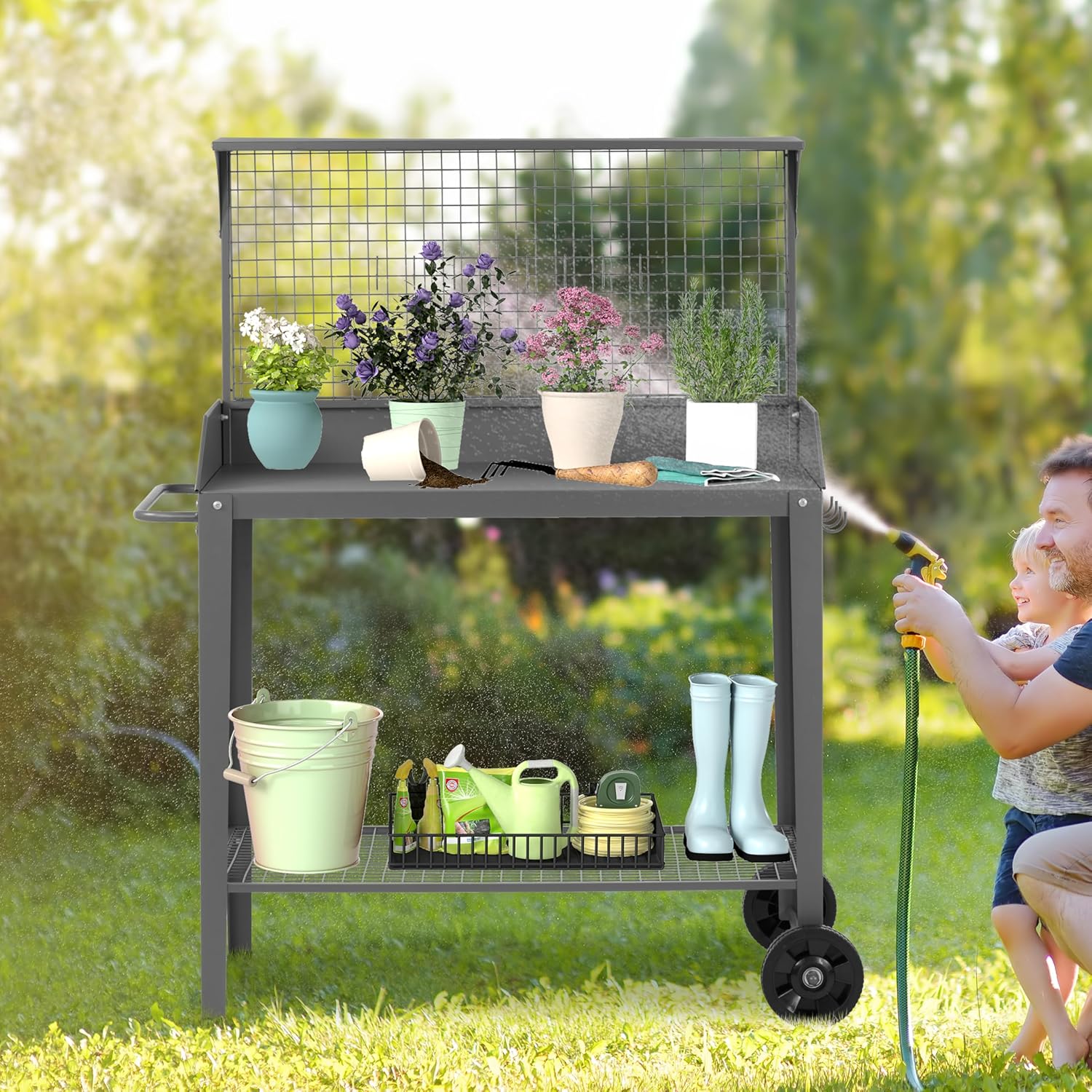 Outdoor Metal Potting Bench with Wheels, Heavy Duty Garden Workbench Table with Storage Shelf (Dark Gray, 52.8"x36.6")