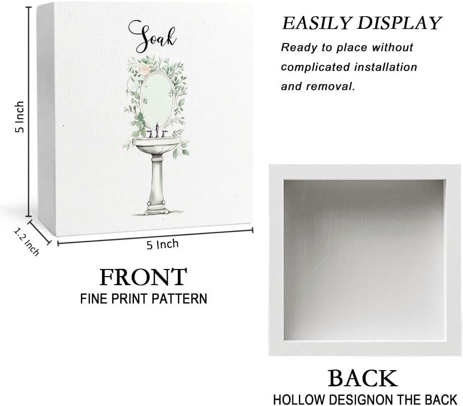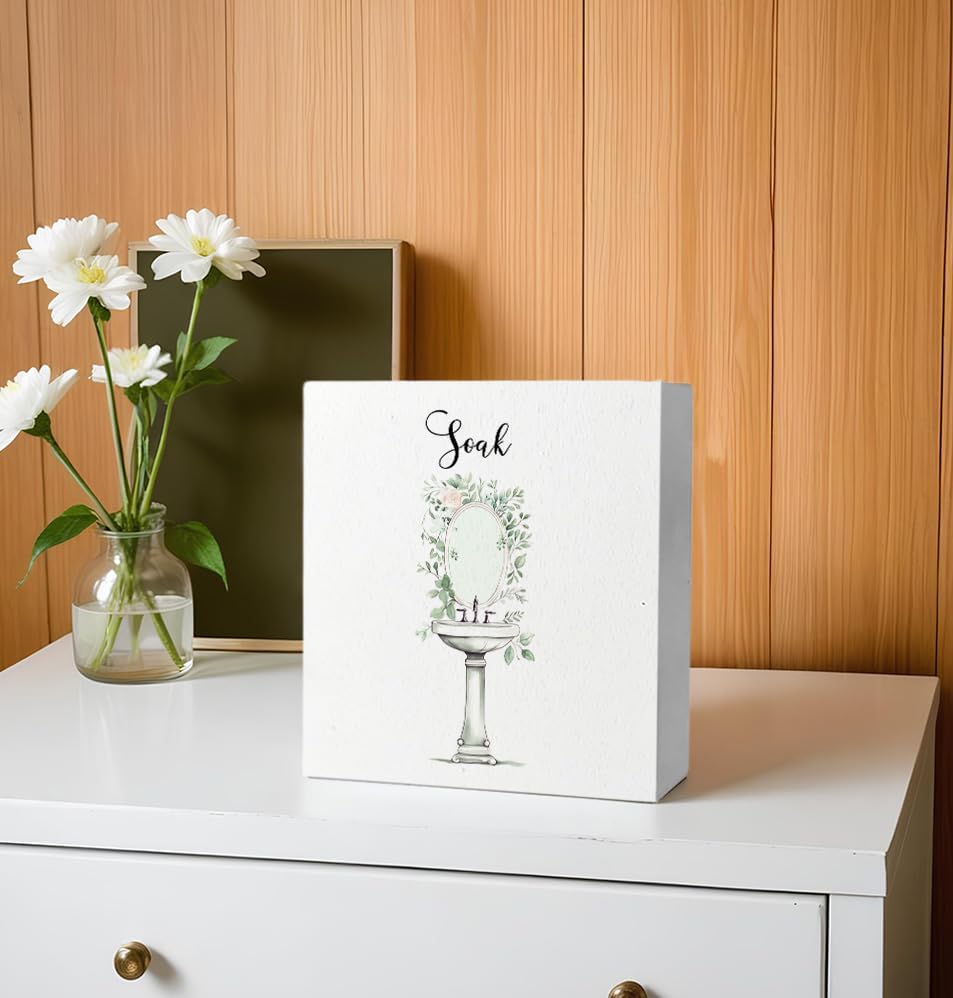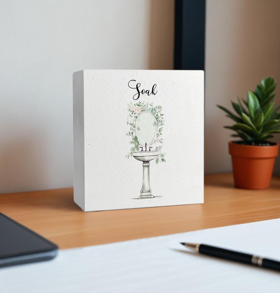 Soak Funny Bathroom Wooden Box Sign, Eucalyptus Botanical Wood Signs for Restroom Bathroom Toilet Half Bath Shelf Counter Decor, 5x5 Inch
