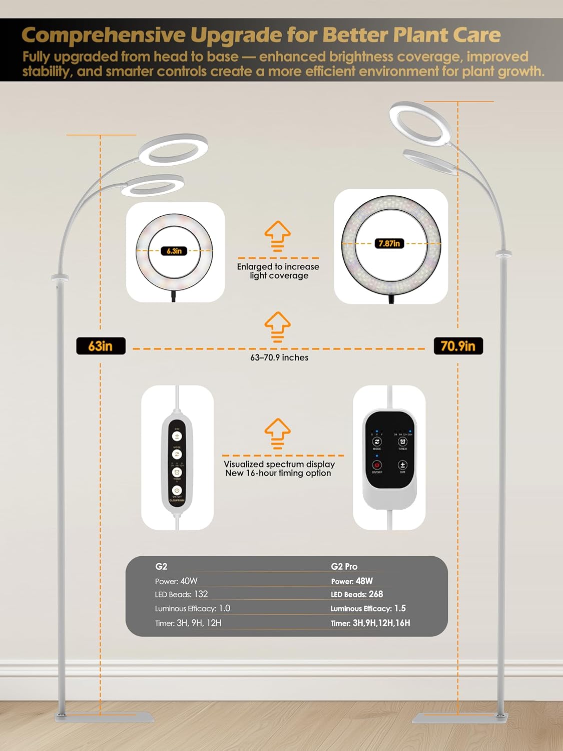 GLOWRIUM Grow Lights for Indoor Plants,Plant Light with 3/9/12/16H Grow Light Timer,2-Head 48W Full Spectrum LED Grow Light, 3 Lighting Mode and Stepless Dimming (White, 48W)