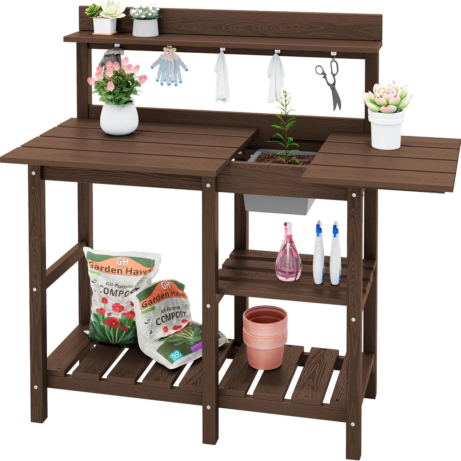 SERWALL Potting Bench Outdoor Potting Table with Sink, HDPE Potting Benches for Outside Gardening Table All Weather Use- Coffee