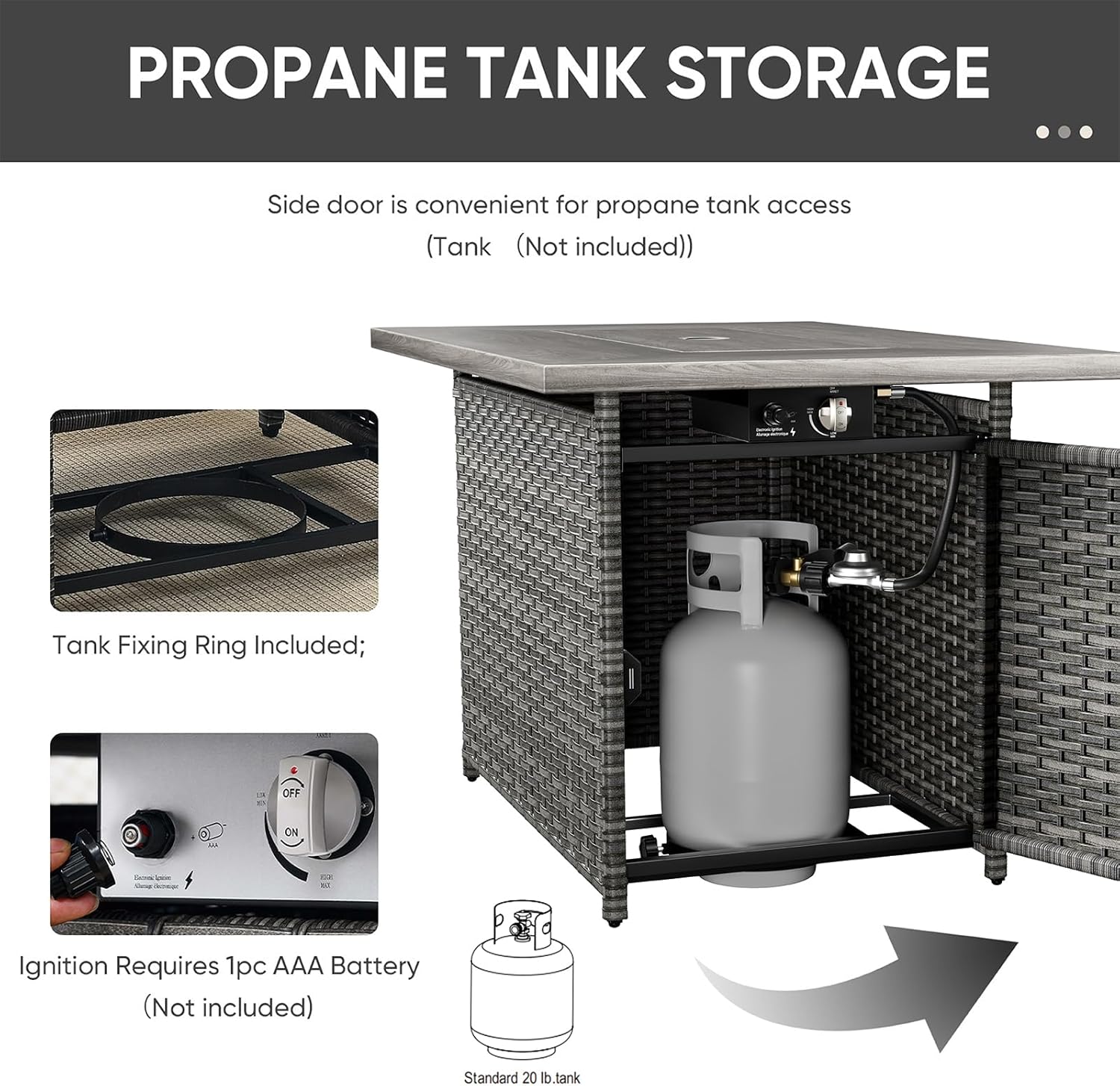 - 【Warm Bonfire and Auto-ignition Device】The gas fire pit table has a heat output of 50,000 BTUs and is equipped with an integrated electronic ignition that adjusts the flame to your desired temperature with the control button. Continuously provide you with enough warmth.