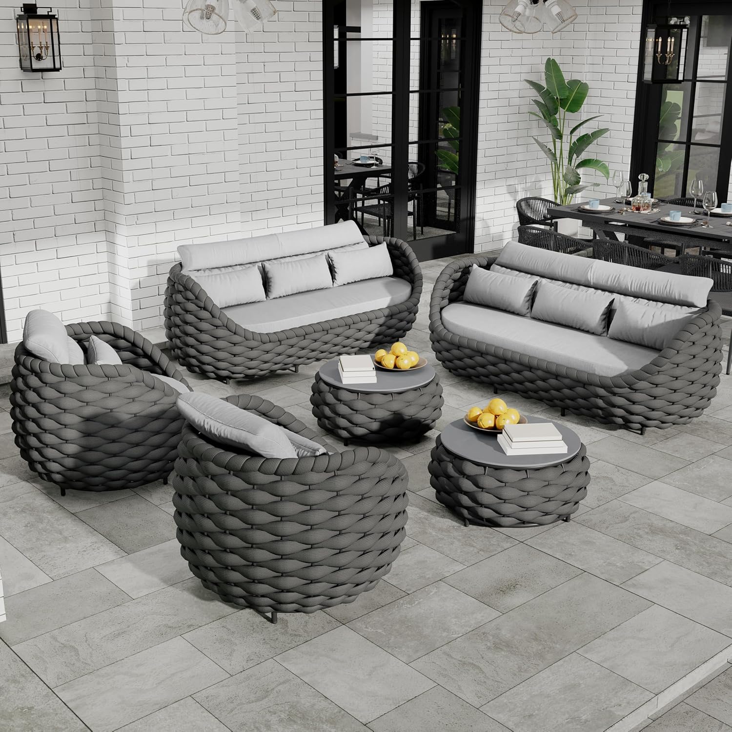 - Furniture set is crafted from reinforced rust-free aluminum alloy frame, wrapped in hand woven polyester rope. The 6 pieces all weather patio upholstered conversation set resists to UV, rain, wind, salt water. Perfect for indoor outdoor even arid or coastal areas