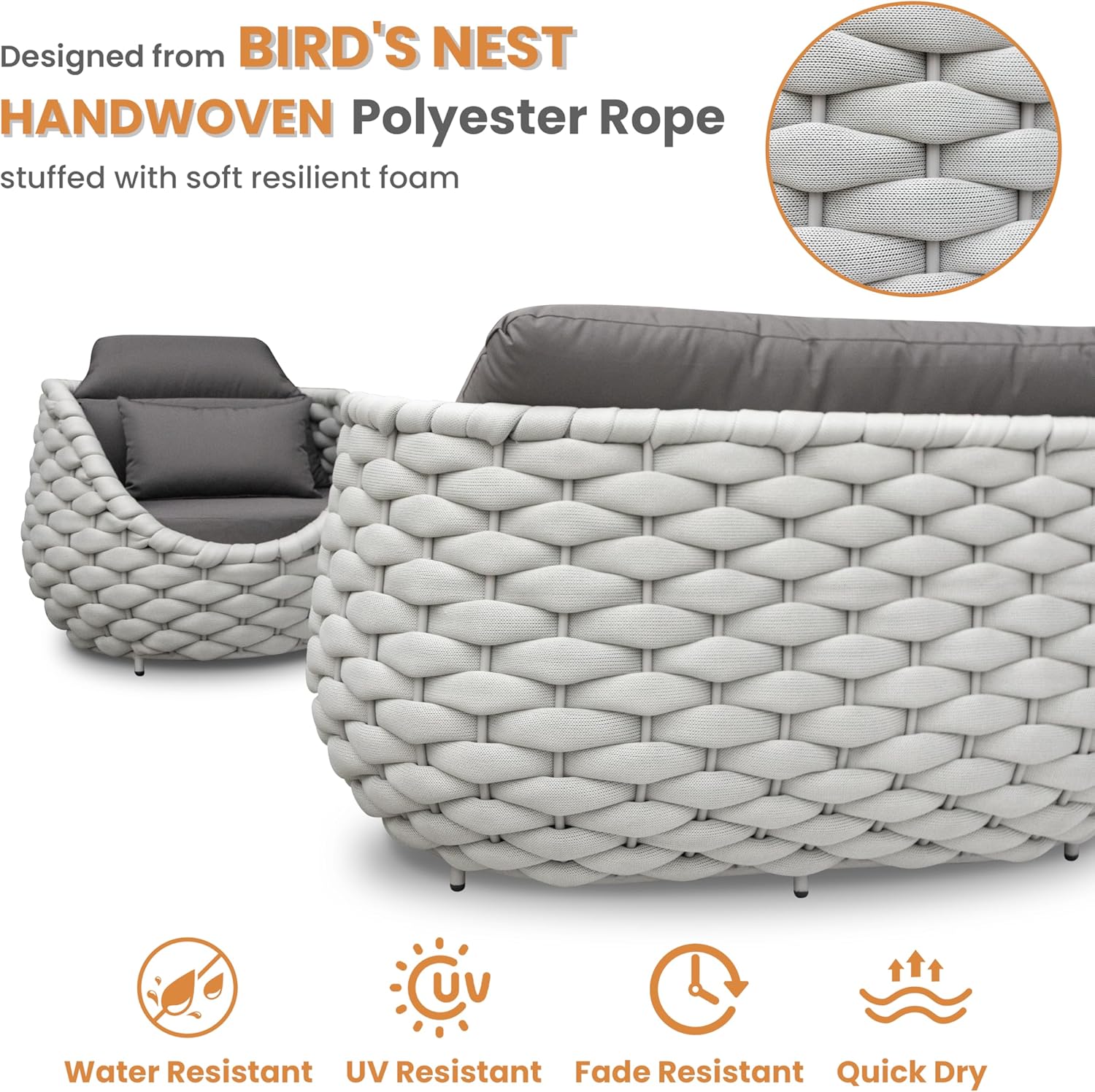 - Inspired by bird's nest shape, the Erotr assembled cushioned lounge set for 7 person combines comfort, elegance and durability. Knitted-like ropes give a warm comfy looking. Curved scoop armrest, supportive backrest and deep cushioning offer an enveloping ultimate relaxation