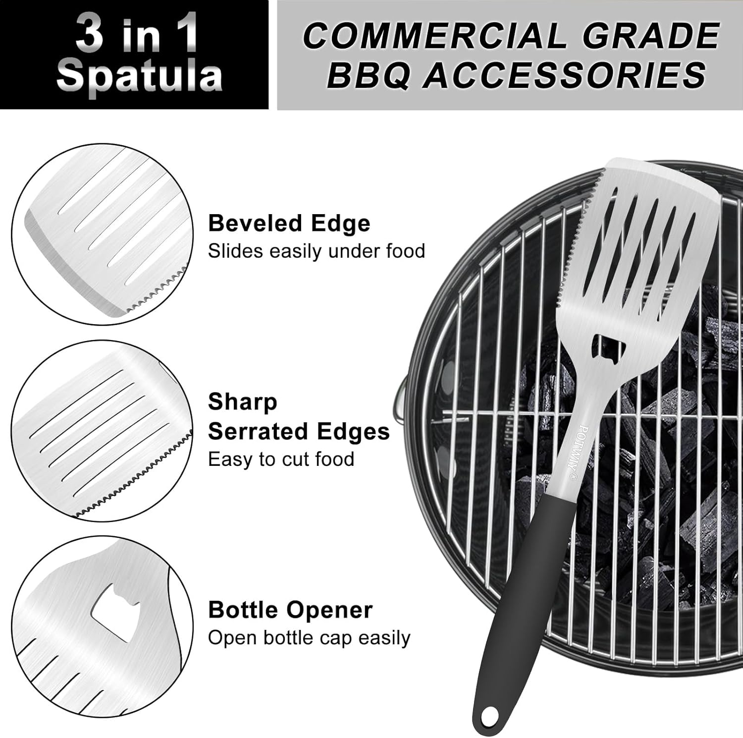 - Multifunctional Grill Utensils Set: The grill tool set with a 3-in-1 grill spatula with serrations and built-in bottle opener, a lockable grill tongs, and a reinforced fork, allowing you to easily flip steaks, flip burgers, and handle delicate vegetables on the grill