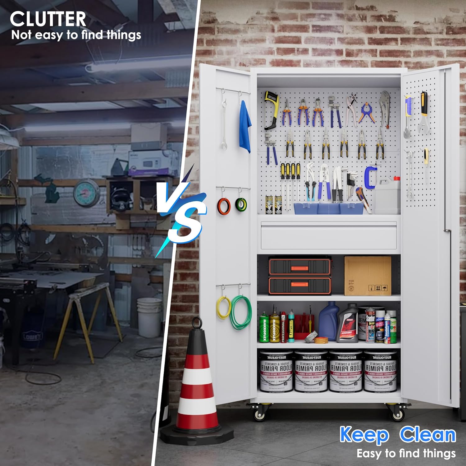 - 【16Hooks & 5 Pegboard & 3 Hanging Rods 】The left door features robust hanging rods and versatile hooks for tools and cleaning supplies, while the right door sports a pegboard for customizable storage with hooks, baskets, and more.