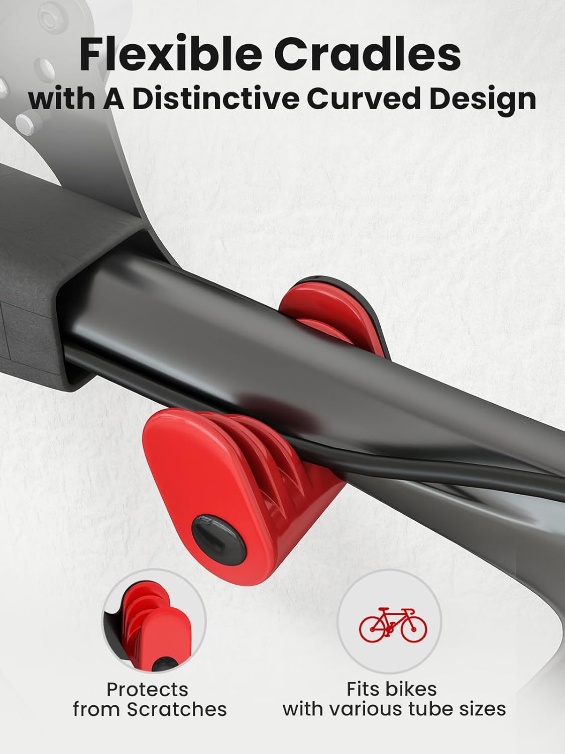 - Anti-Scratch & Secure Bike Holder - The flexible cradles with unique curved design protects your bike from scratches and paint damage. Additionally, the included front wheel stabilizing strap ensures your front wheel stays securely in place, preventing accidental contact with the wall in your apartment, garage, or home
