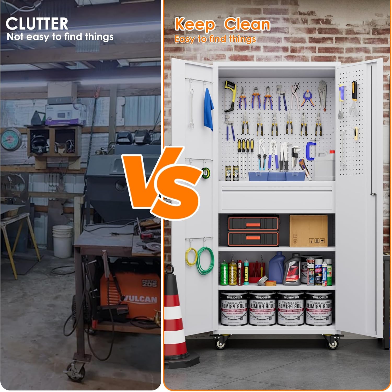 - 【Upgraded Design & More Space】 Storage cabinet offers plenty of space to meet your storage needs. There are pegboard on the cabinet right door and 2 Sides. The left door has a hanging rod and 6 small hooks. Open the door and inside there is a big drawer