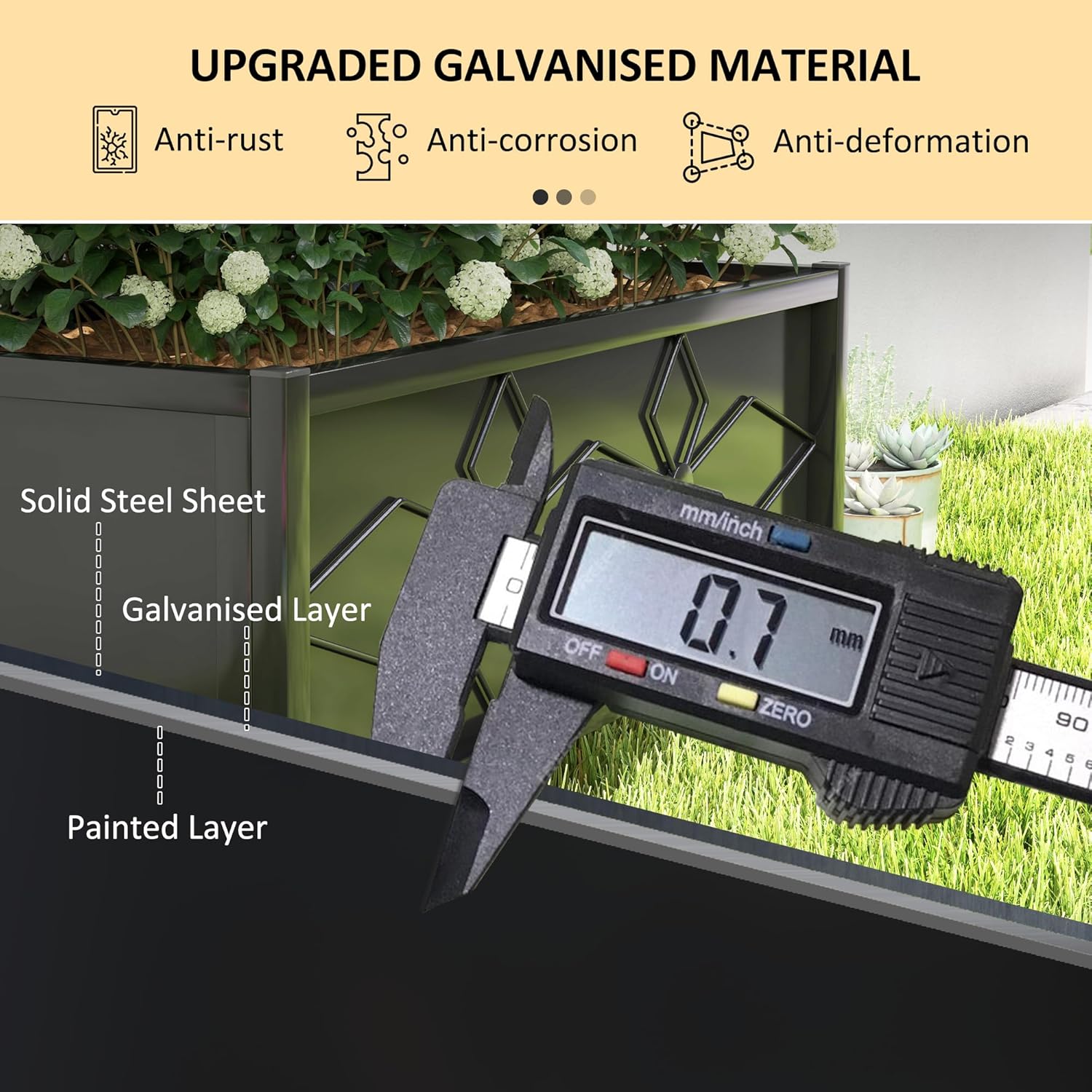 - Strengthened Construction: The planter box crafted with 0.7 mm thickened galvanized steel, properly maintaining the frame strength all the year round