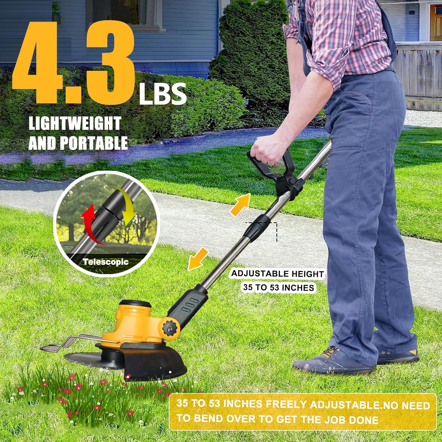 - 🎁【Lightweight and comfortable design】Our weed eater battery powered weighs only 4.3 pounds, whether it's housewives or elderly people, It can all be easily used. electric weed eater cordless ergonomically designed handle can work for long periods of time without feeling fatigued, enjoy fast and efficient pruning, easily maintain the cleanliness and tidiness of gardens and courtyards.