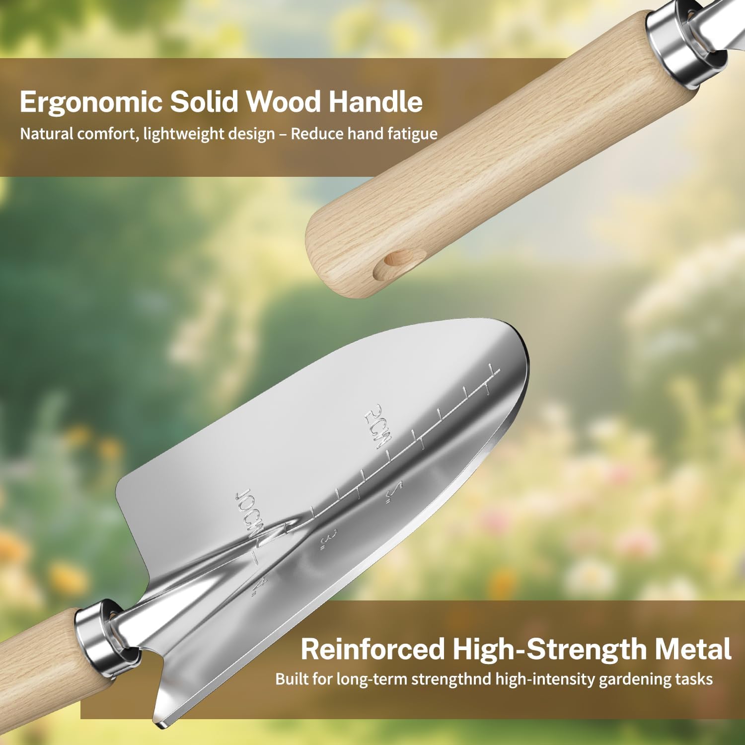 - 【Timeless Tools for Lifelong Gardening】Our high-quality stainless steel tools feature a smooth, non-porous surface that resists dirt, rust, and corrosion. With just a quick rinse and a light wipe, they'll stay looking brand new. Say goodbye to tools that wear out quickly—these will keep their shine for years to come.