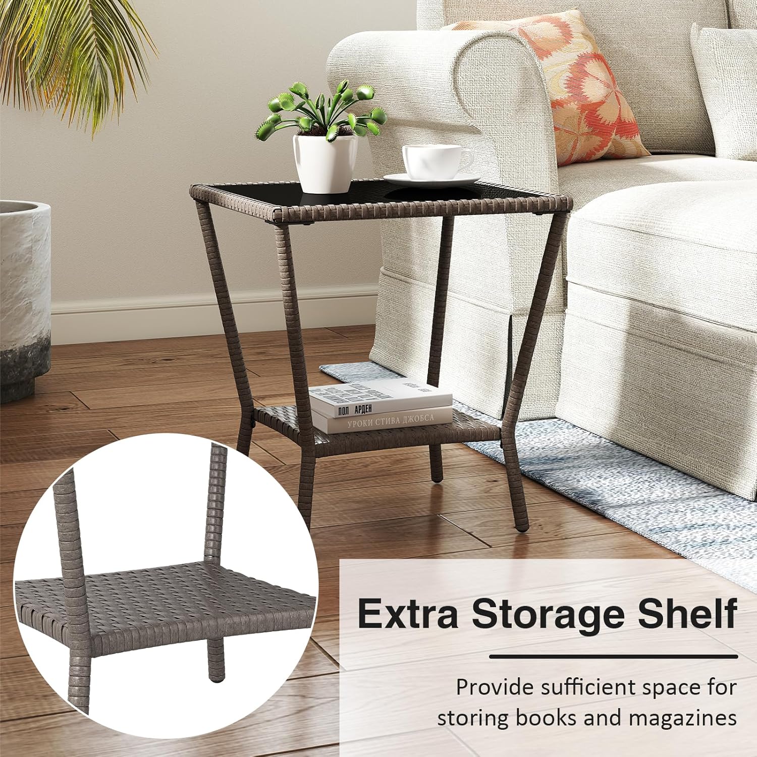 Outdoor Small Patio Table - PE Rattan Coffee Table, Wicker Side Table for Patio, Balcony & Porch, Durable & Iron Frame (2, Sesame Brown)
