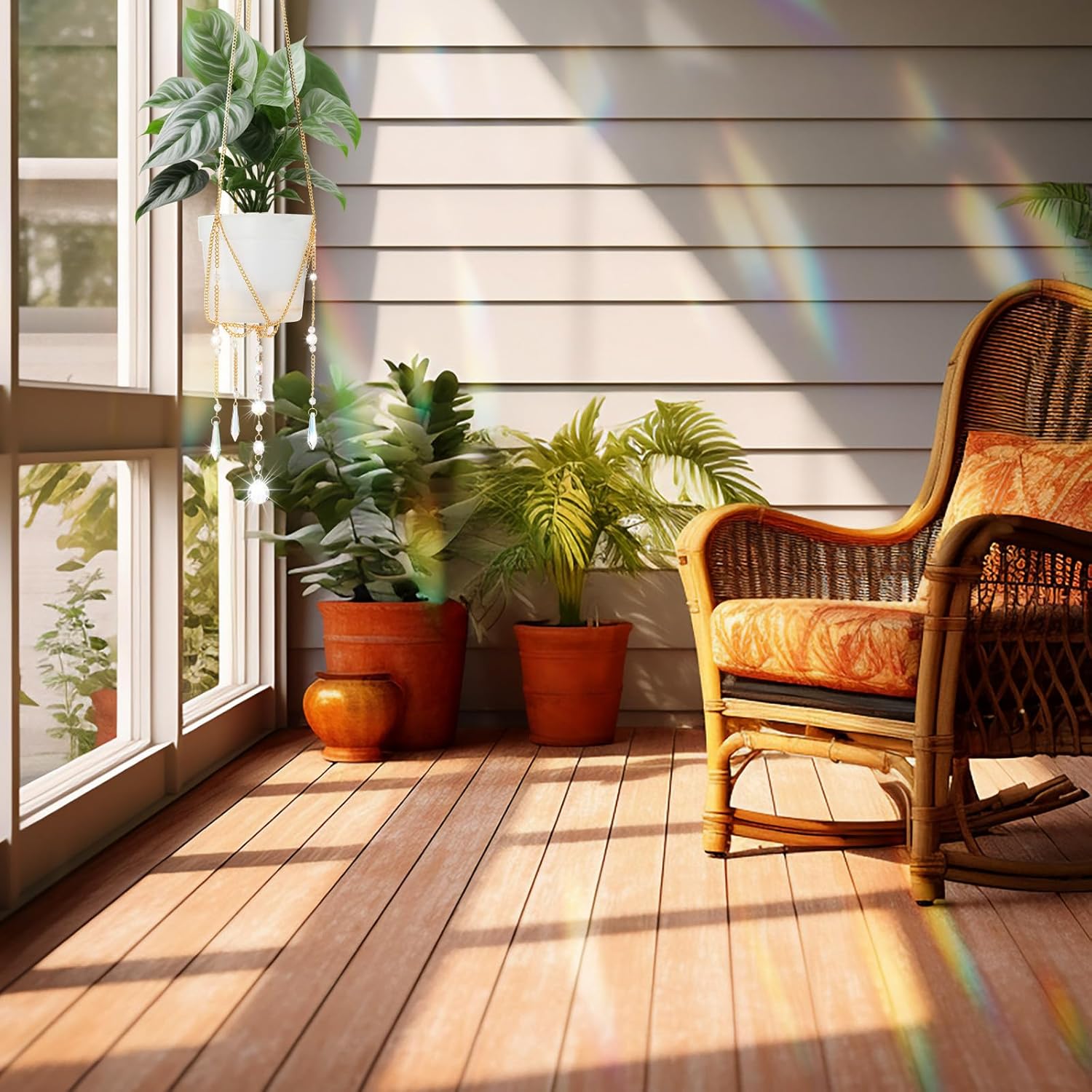 - Indoor Decor: transform any room with the Sun Catcher Plant Hanger; This beaded plant hanger features a colorful glass sun catcher that creates a dazzling rainbow effect, adding vibrant beauty to your space; Use it as the hanging plant holder to brighten up your home