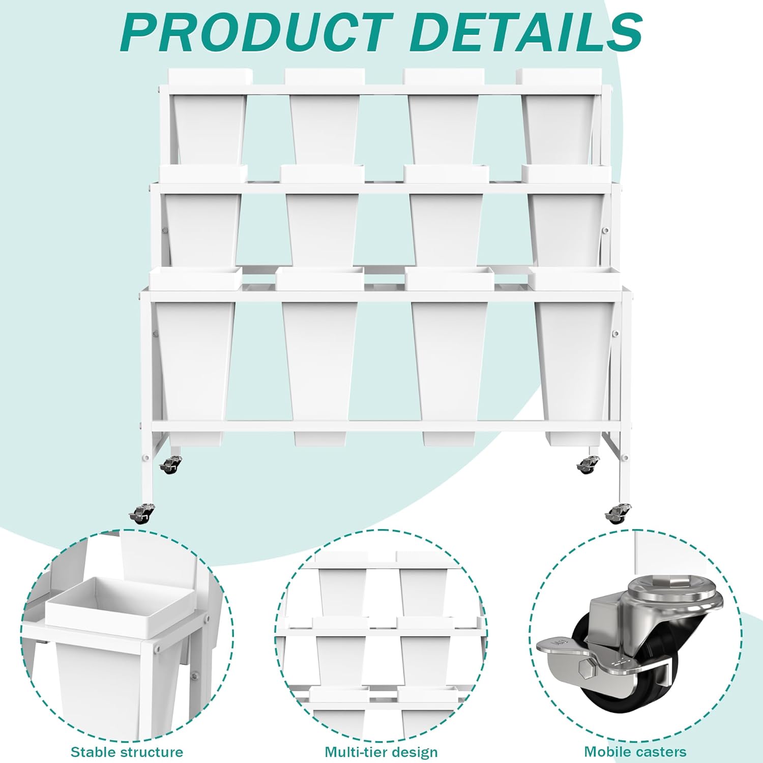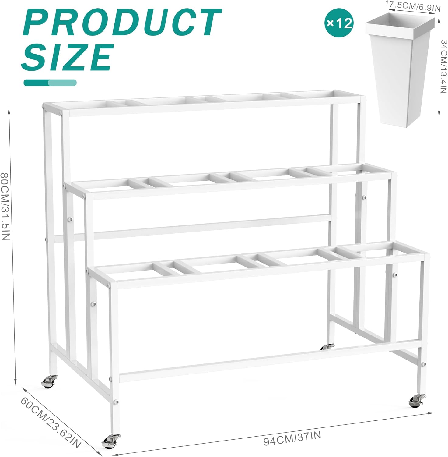 Putros Flower Display Stand with 12 Buckets White 3 Layers Metal Floral Cart with Wheels Moving Florist Bouquet Bar Plant Shelf for Indoor Outdoor Patio Garden Party Decor