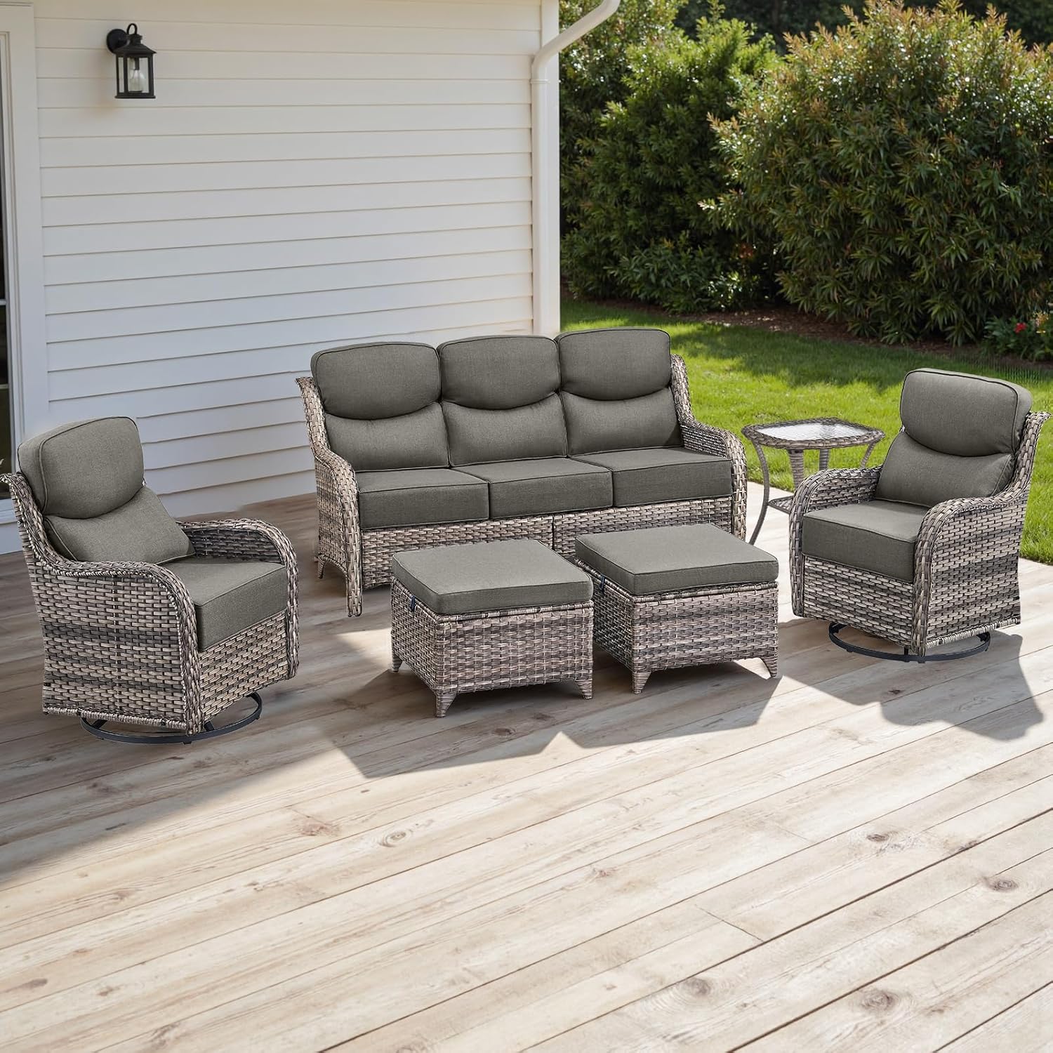 Wicker Outdoor Patio Furniture Set - 6 Piece Patio Conversation Sets with Swivel Rocker Chairs, Ottomans, Sofa and Side Table, 6 inch Cushions, Waterproof Wicker, for Porch Deck Mixed Grey/Grey