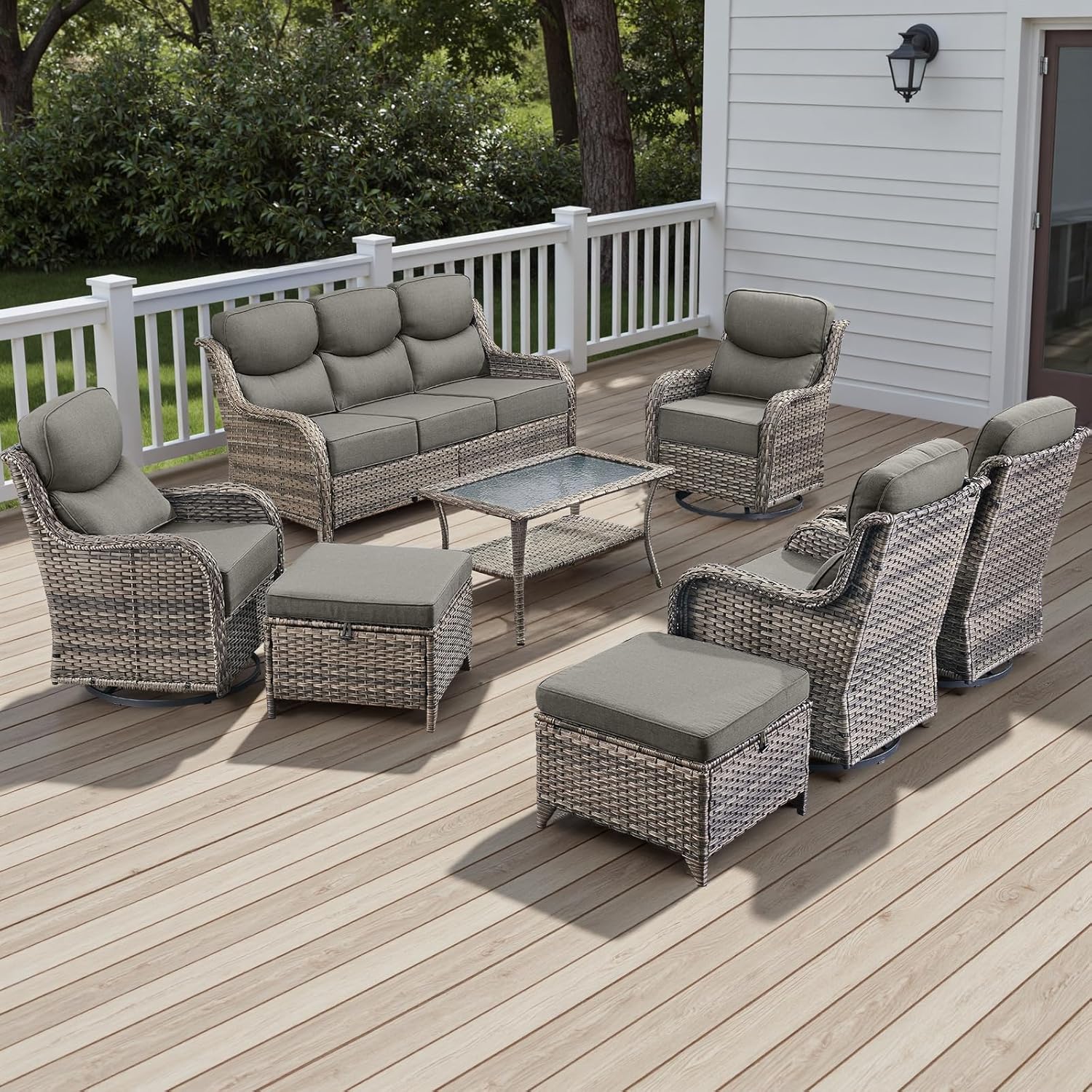 Wicker Outdoor Patio Furniture Set - 8 Piece Patio Conversation Sets with Swivel Rocker Chairs, Ottomans, Sofa and Table, 6 inch Cushions, Deep Seating, for Porch Deck Mixed Grey/Grey