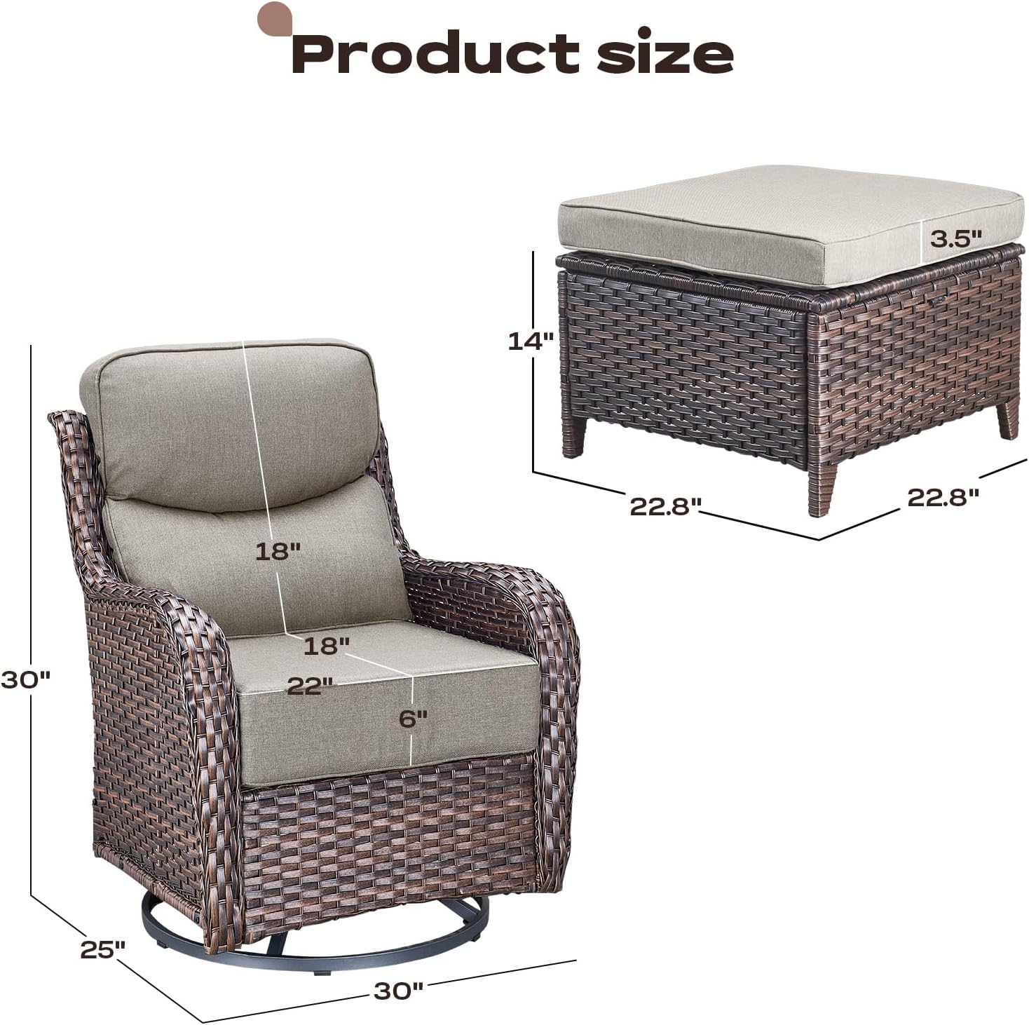 - 【Deep Seating & 6 inch Comfort Cushions】This rattan patio swivel chairs feature deep and wide seats with 6-inch thick sponge-padded cushions create the ultimate patio seating experience.