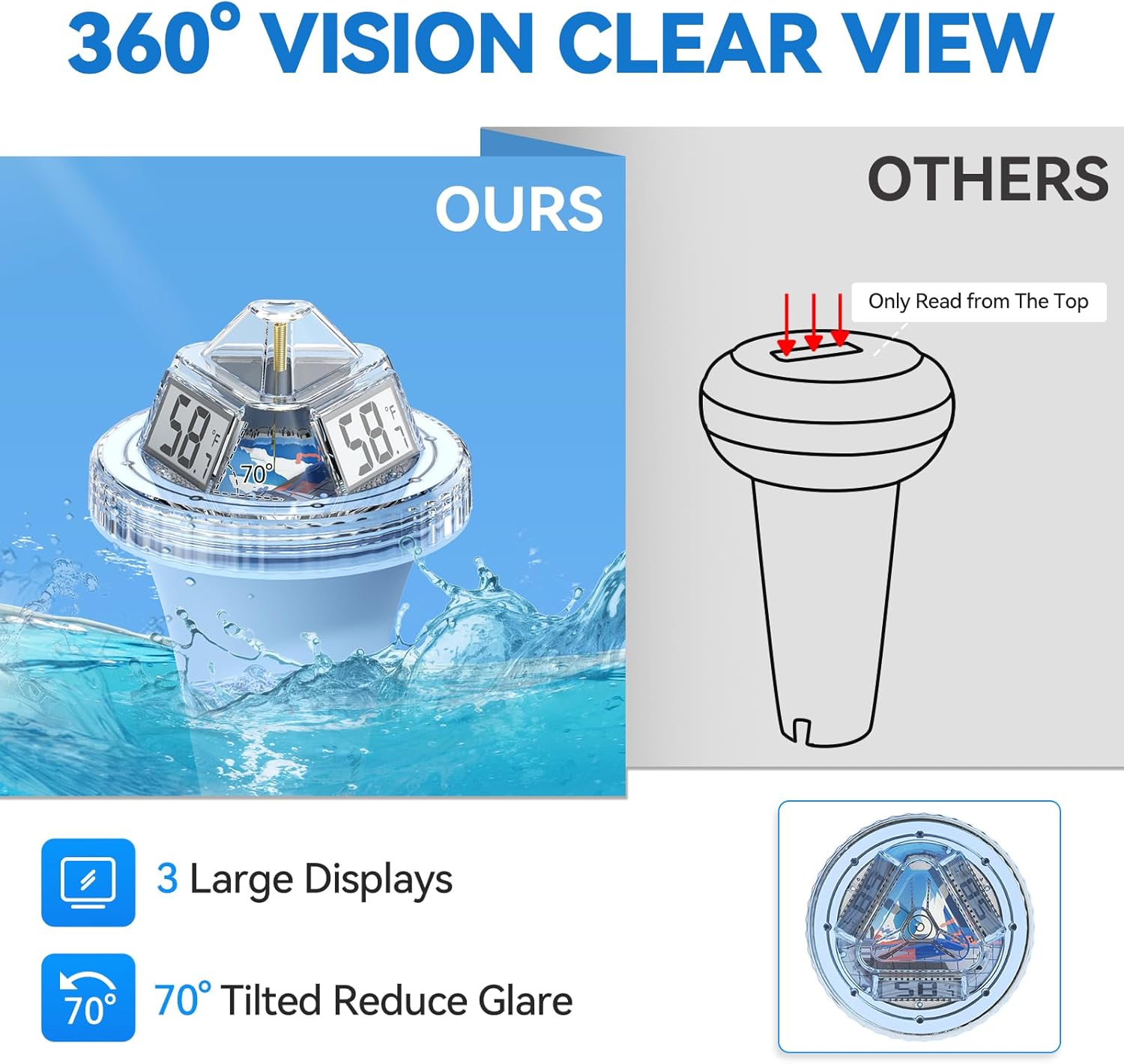 - 【Anti-fog Screen & IP68 watertight】These screens has been all specially treated to prevent fogging up, ensuring you can check the temperature without any distractions, rain or shine. Say goodbye to condensation and glare with our advanced get a crystal-clear display in all conditions with our wireless pool thermometer.
