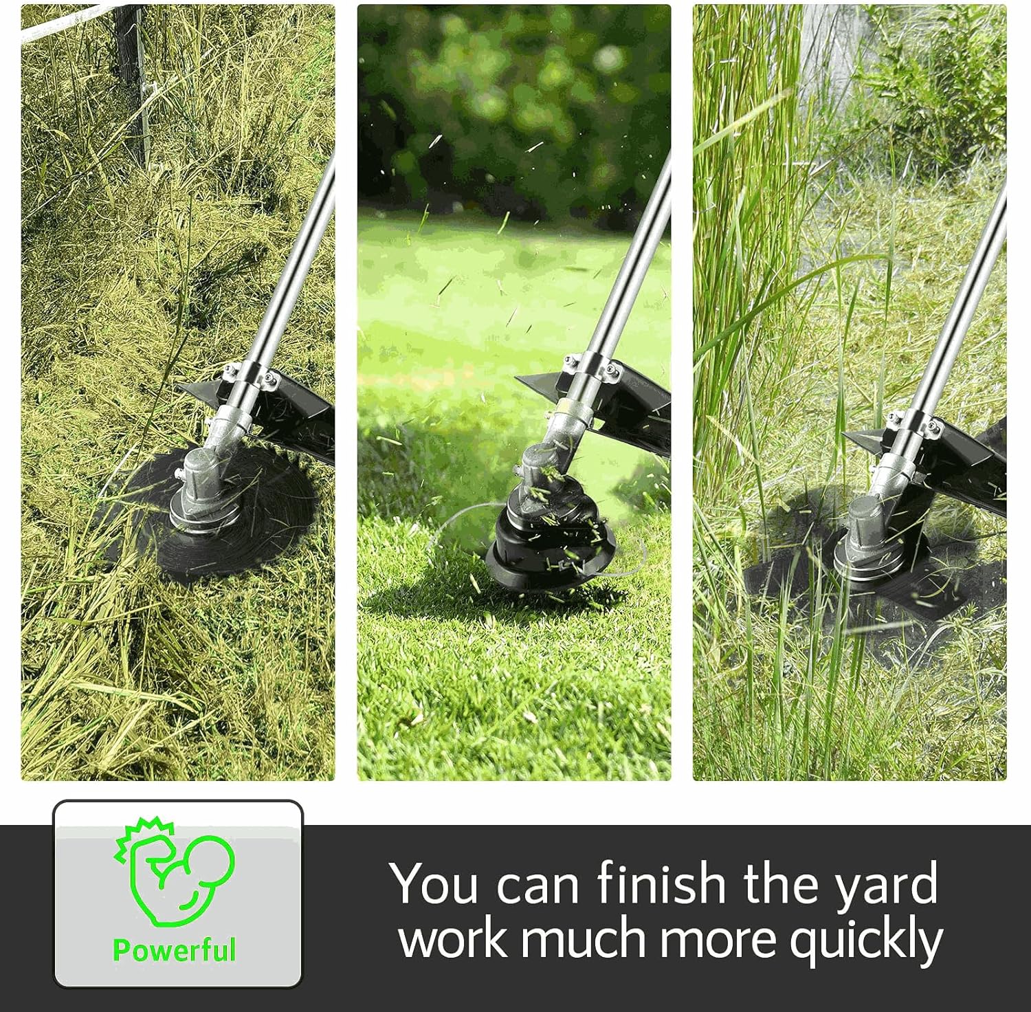 - 4-In-1 Detachable Trimming Heads: The weed wacker equipped with 4 trimming heads, easily convert from 4T blade to 3T blade or dual thread head. 0.09" dual line head is intended to cut lawn & tender grass; 3T blade/saw blade brush cutter to power through weed and small shrub vegetation or withered grass, etc. A 10-inch cutting path can help quickly mowing bush, thicker shrub grass, sapling or vegetation