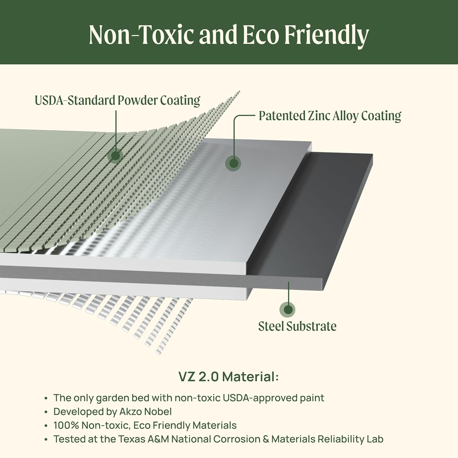 - 🌱Better Material: We have combined a Zinc, Magnesium, and Aluminum coated steel with our award-winning and USDA standard AkzoNobel paint to develop a new material which we call VZ 2.0. The first material of its kind is 100% safe, eco friendly, with a long 20+ year life. VZ 2.0’s exceptional performance has been verified at the Texas A&M National Corrosion & Materials Reliability Lab