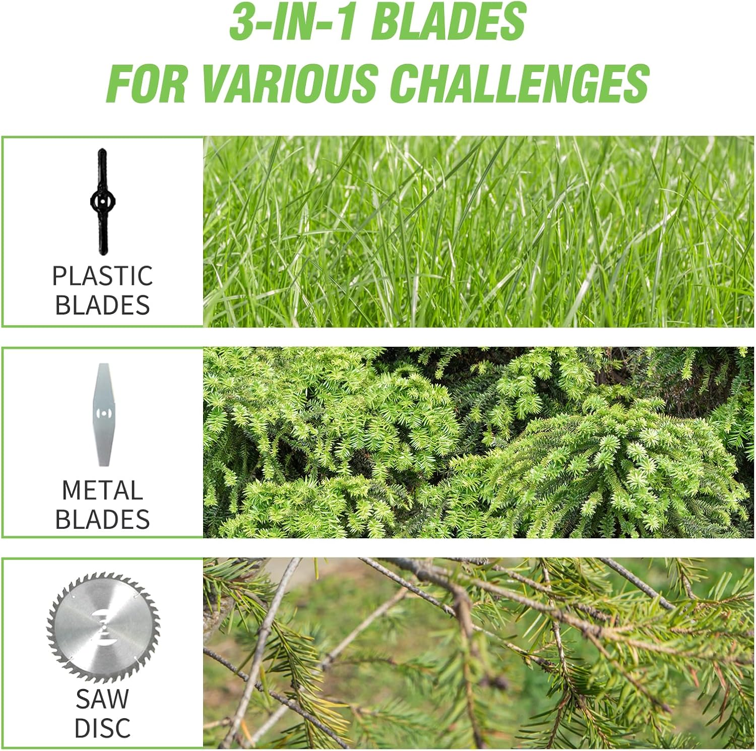 - 5-Blade 3-in-1 Professional System: Master all cutting tasks with 5 specialized blades, including heavy-duty and serrated options. Perfect as both precision lawn edger and powerful brush cutter for slopes, wetlands, and high branches. For optimal motor maintenance, we recommend resting the machine for 15 minutes after 30-45 minutes of continuous use