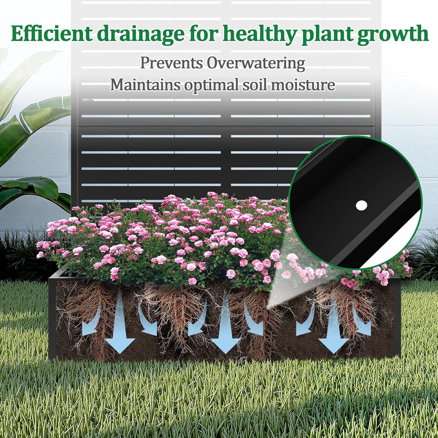- Optimal Water Management: The planter with trellis features a deep planting bed, offering generous space for healthy root development. The raised garden bed also comes with built-in drainage holes that efficiently prevent water accumulation, helping your plants maintain proper moisture levels for optimal growth.