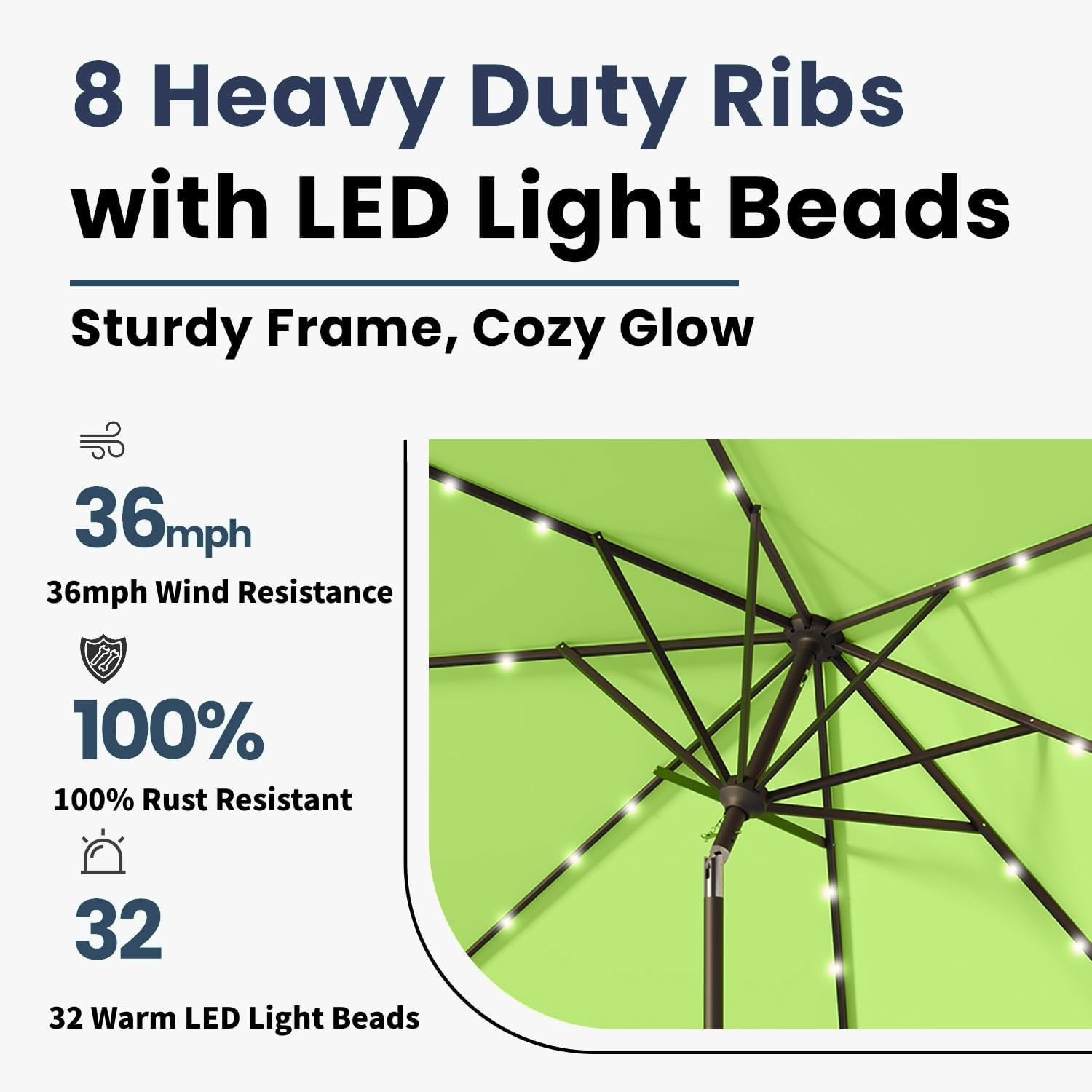 9FT Solar Umbrella 32 LED Lighted Patio Umbrella Table Market Umbrella w/Tilt and Crank, UV-Resistant Outdoor Umbrella for Pool, Garden, Deck, Apple Green