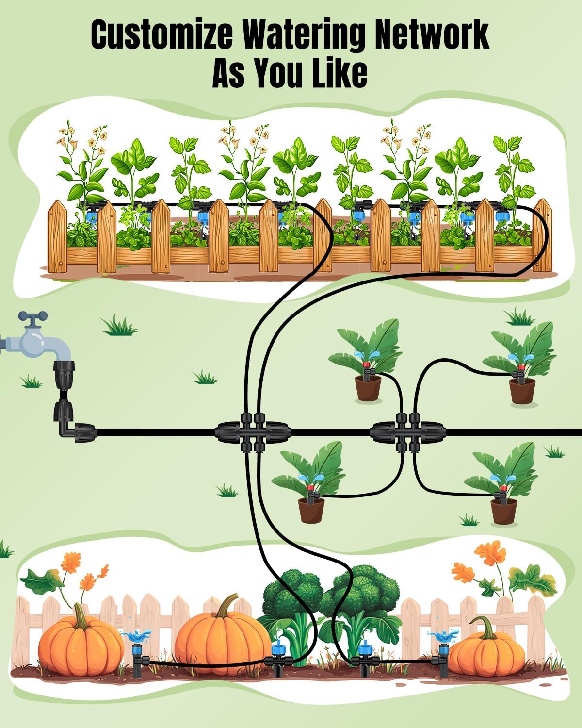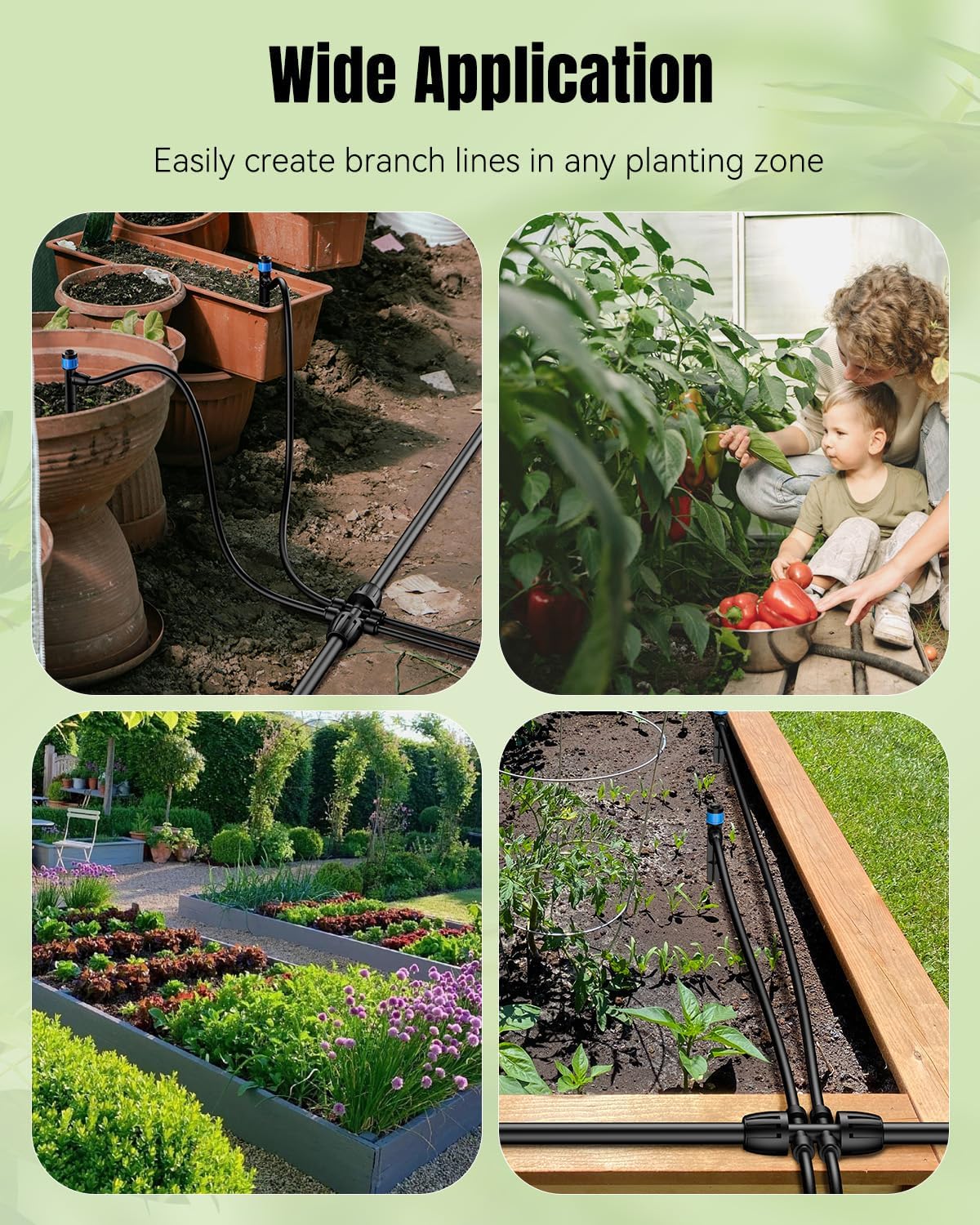 - Wide Application: Ideal drip irrigation parts for creating branch lines in any planting zone, including raised beds, vegetable gardens, greenhouses, patios, lawns, and more. Effortlessly bring life to every corner of your space