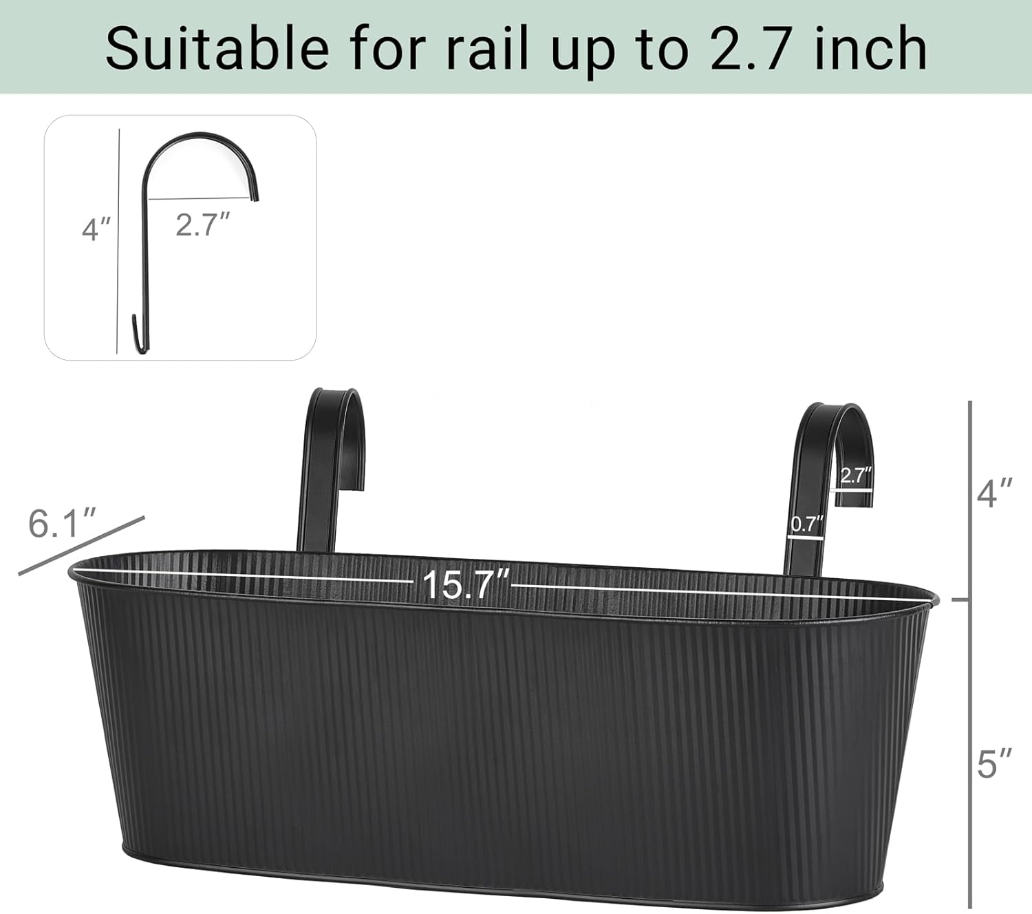 - Note: The package includes three planters and six hooks. Planter is 15.7" x 6.1" x 5". Hook is 4" x 2.7โ x 0.7"(Suitable for rail up to 2.3 inch). you need to install the iron bucket yourself when it arrives.