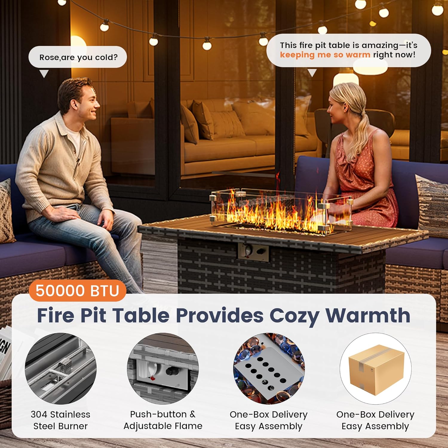 - Safe, Warm and Versatile Fire Pit Table: The CSA-certified smokeless propane fire pit in this patio set with fire pit delivers up to 50,000 BTU of heat. Its metal lid transforms it into a dining or coffee table when not in use, making it perfect for day or night gatherings. The frame made of FSC-certified wood.