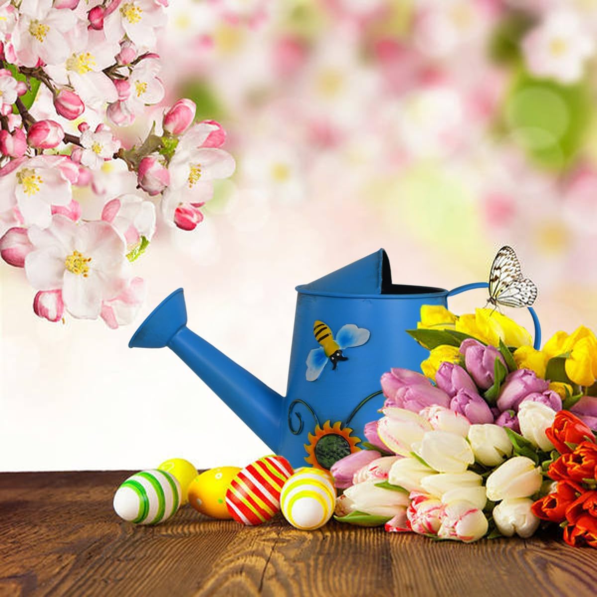 - Decorated with lively scene of sunflowers and bee, this shiny blue painted metal watering can should make a nice, cheery addition to anyone's décor.