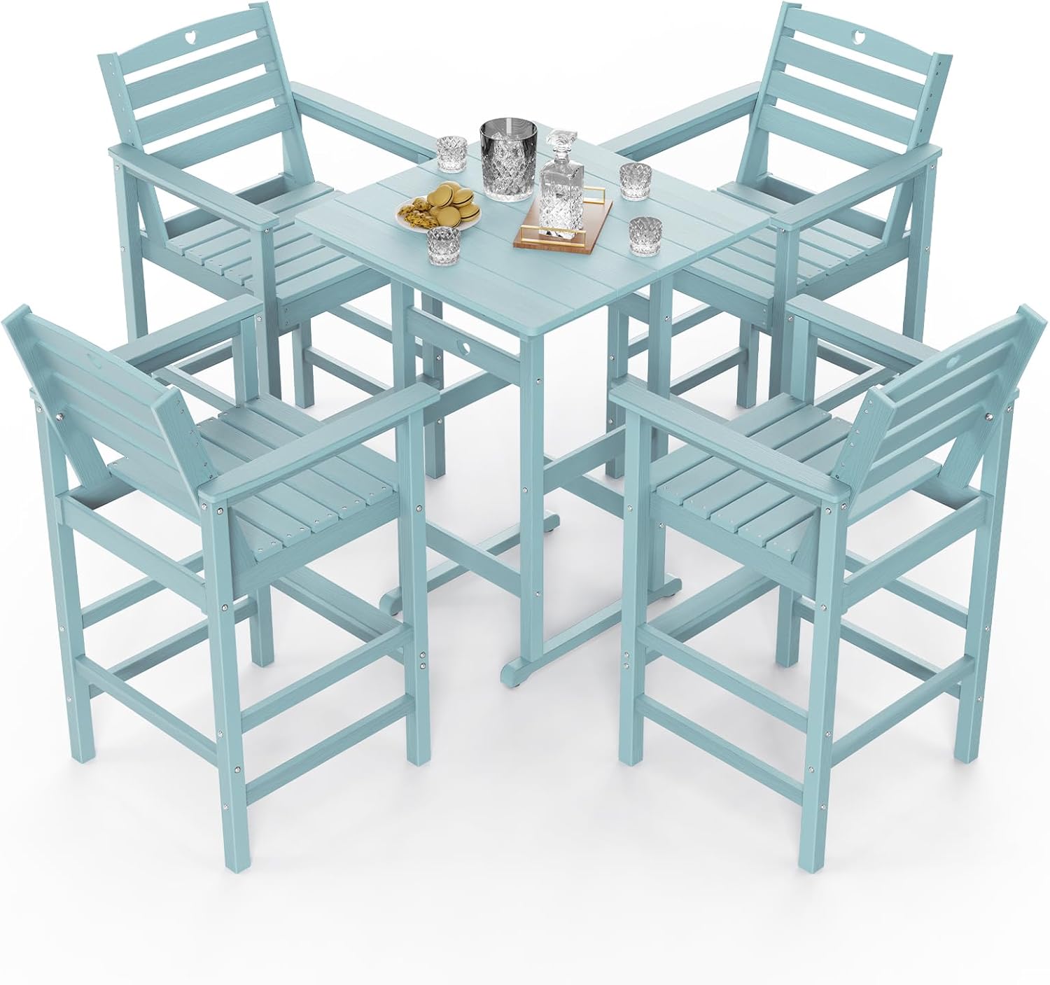5-Piece Bar Height Outdoor Table and Chairs Set, HDPE Wood Grain Patio Bar Table and Chairs with Heart Cutout Design, Weather-Resistant Bar Height Furniture for Deck, Porch, Pool (Light Blue)