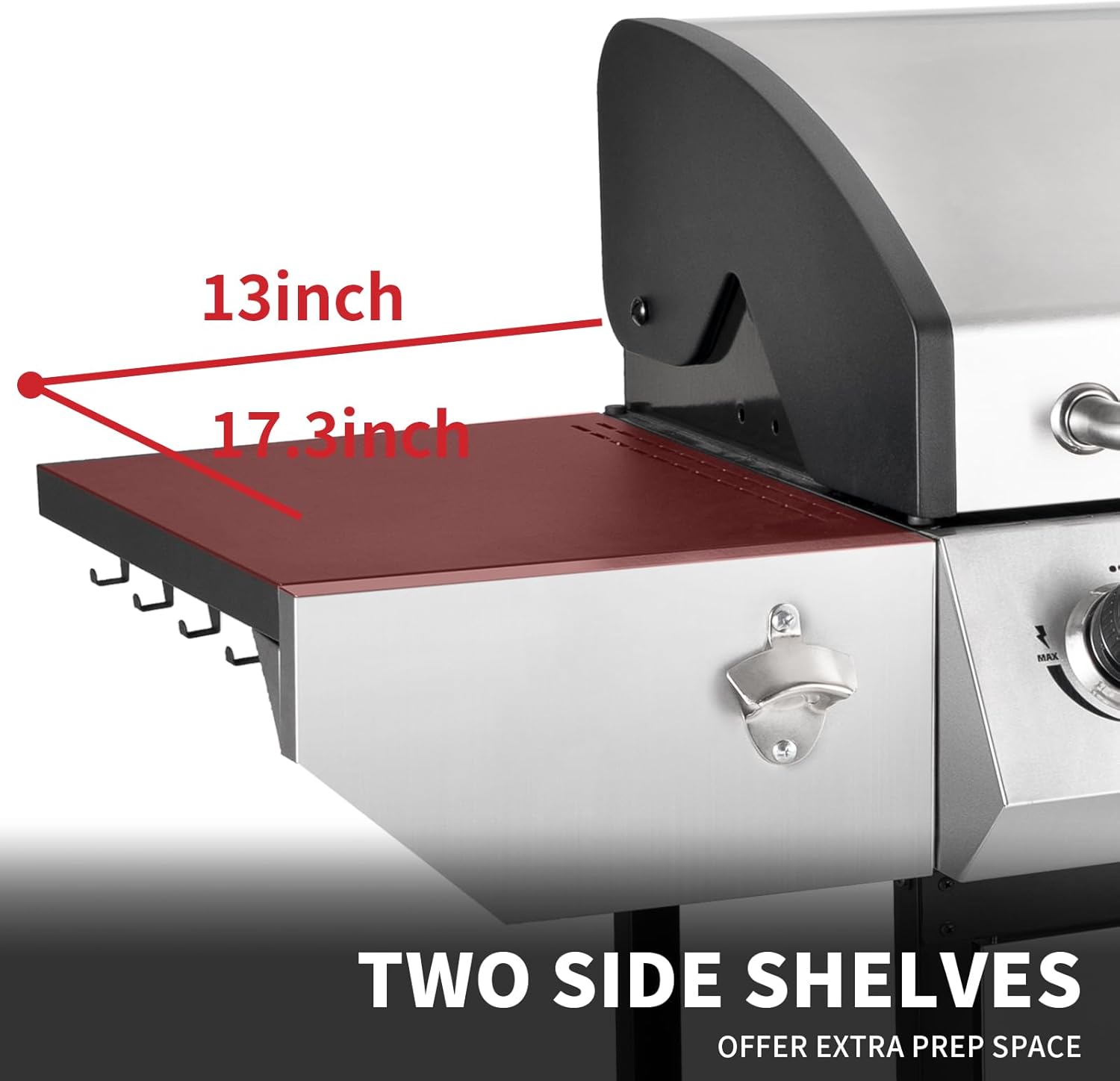 - 【53000BTU COOKING POWER】 Barbecue Gas Grill’s burner head is made of 304 stainless steel. 4 main burners and side burner Gas grills provide a total 53,000 BTU of cooking power including 44,000BTU main cooking space and 9,000 BUT side burner.