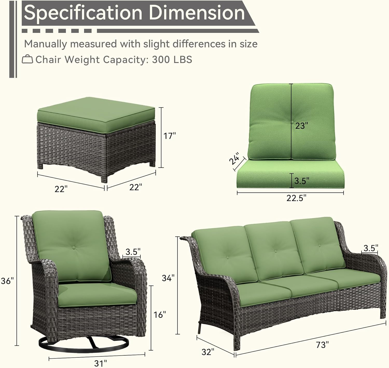 - [Specification Dimension] 31" Wx32" Dx36" H Patio Swivel Rocker Chair. Per Weight Capacity: 250-300 LBS. 73" Wx33" Dx34" H Sofa. 22" Wx22" Dx17" H Ottoman. Measured manually, which may allow minor errors