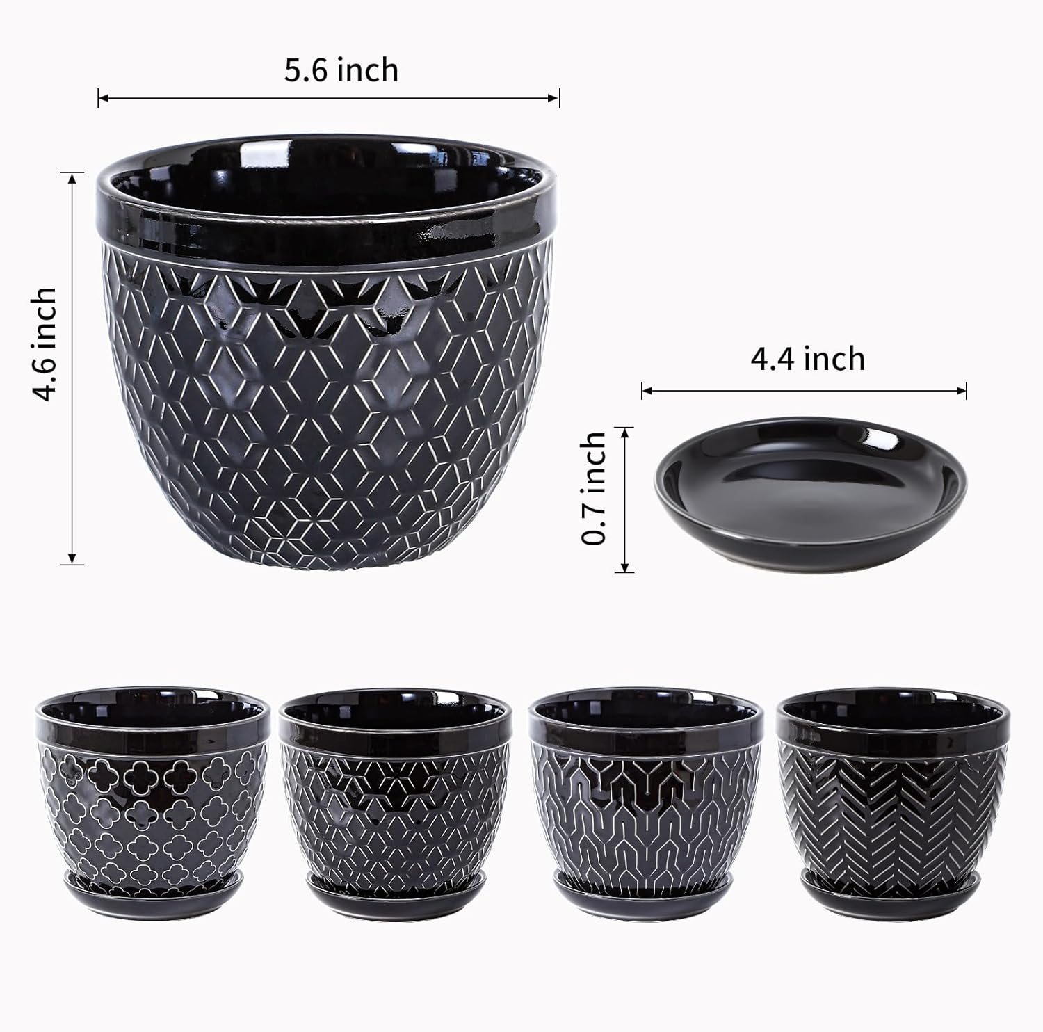 Sureasy Ceramic Indoor Plant Pots - 5.6 Inch Flower Pots for Plants with Drainage Hole and Saucer, Embossed Planter for Succulents, Orchid, Cactus, Indoor Home Decor, Set of 4, Black