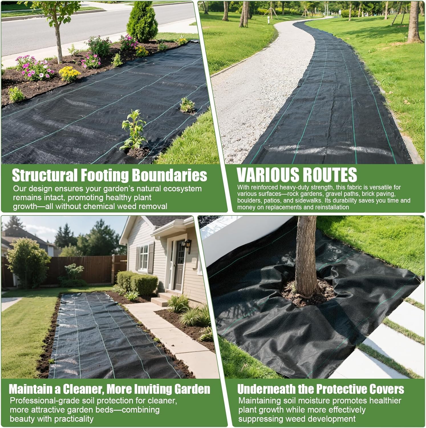 - 【Wide Application】With its reinforced weave, this weed control fabric stabilizes driveways by preventing gravel shift and erosion, while its dense barrier blocks weeds to promote plant health. Perfect for agricultural fields, landscaping, pavers, and construction sites - controlling weeds, stabilizing surfaces, and preventing erosion all in one.