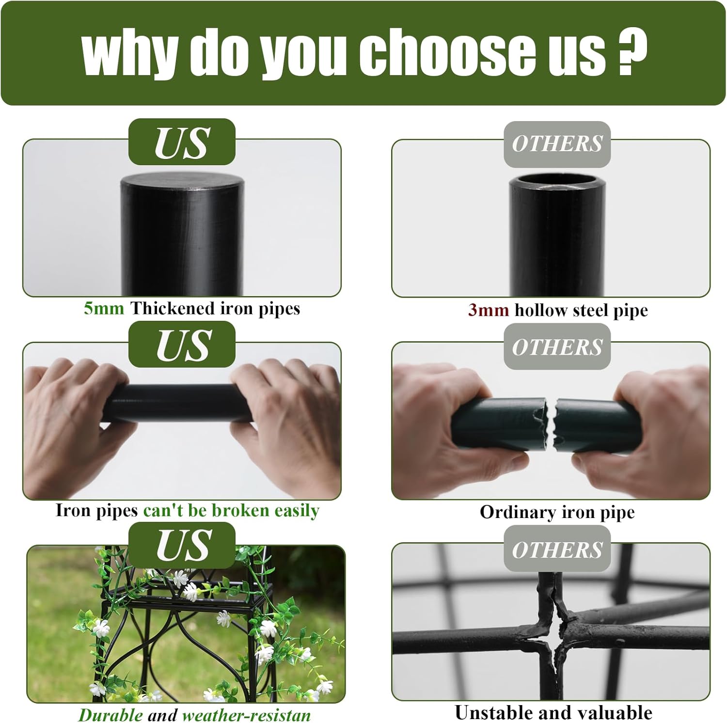 - Robust Stability: The square four-legged base ensures exceptional stability, allowing you to confidently position the trellis in your garden. It stands tall as a reliable support for your vigorous vines and climbing plants without the risk of tipping over.