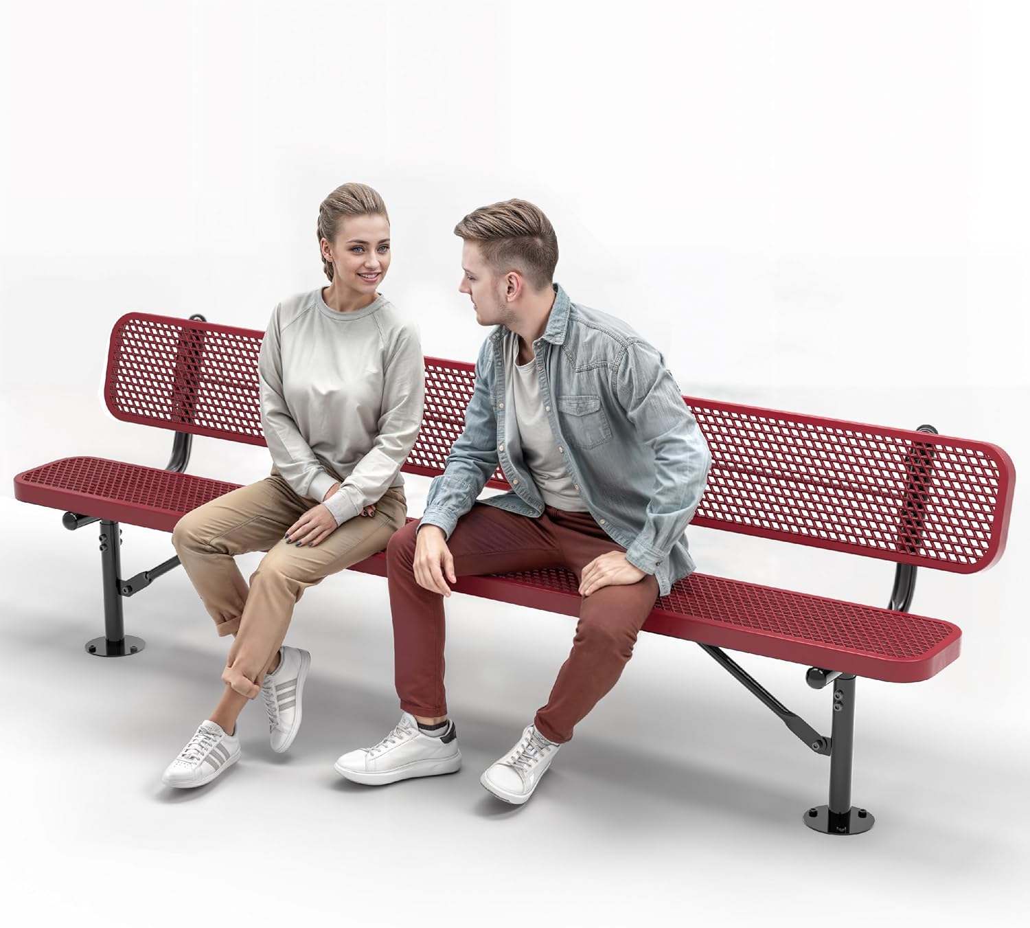 Heavy-Duty Outdoor Metal Bench, Thermoplastic-Coated, Surface, Weatherproof, Commercial-Grade for Parks, Gardens, Patios, Stores & More (8 Ft - Surface with Back, Red)
