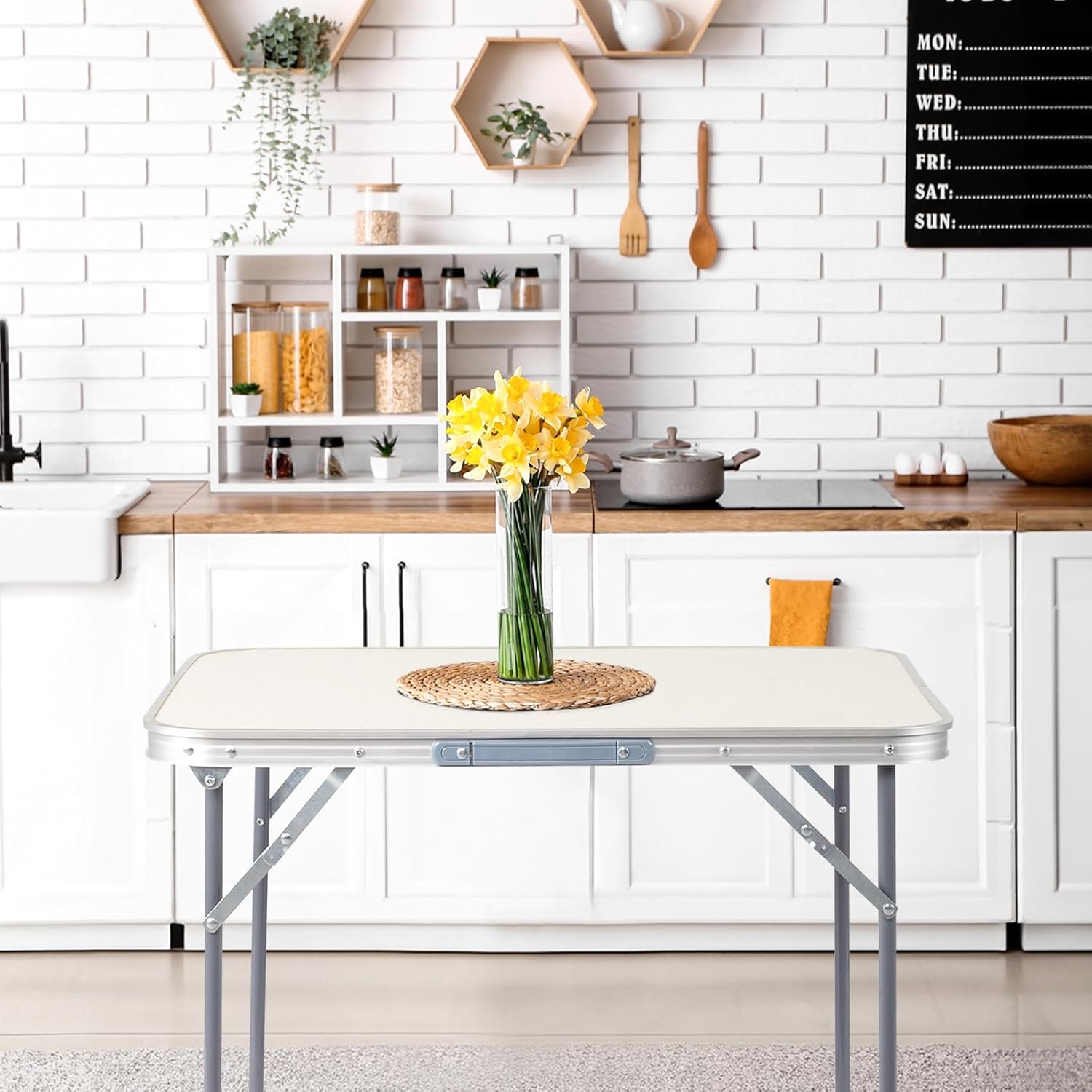 - 【CONVENIENT DESIGN】The rv outdoor table can be easily opened in seconds with just a few simple steps. Quickly fold with the side locks and carry handle. The desktop features fiberboard that is easy to clean stains only by swiping. The 3ft folding table provide convenience in a variety of places for you