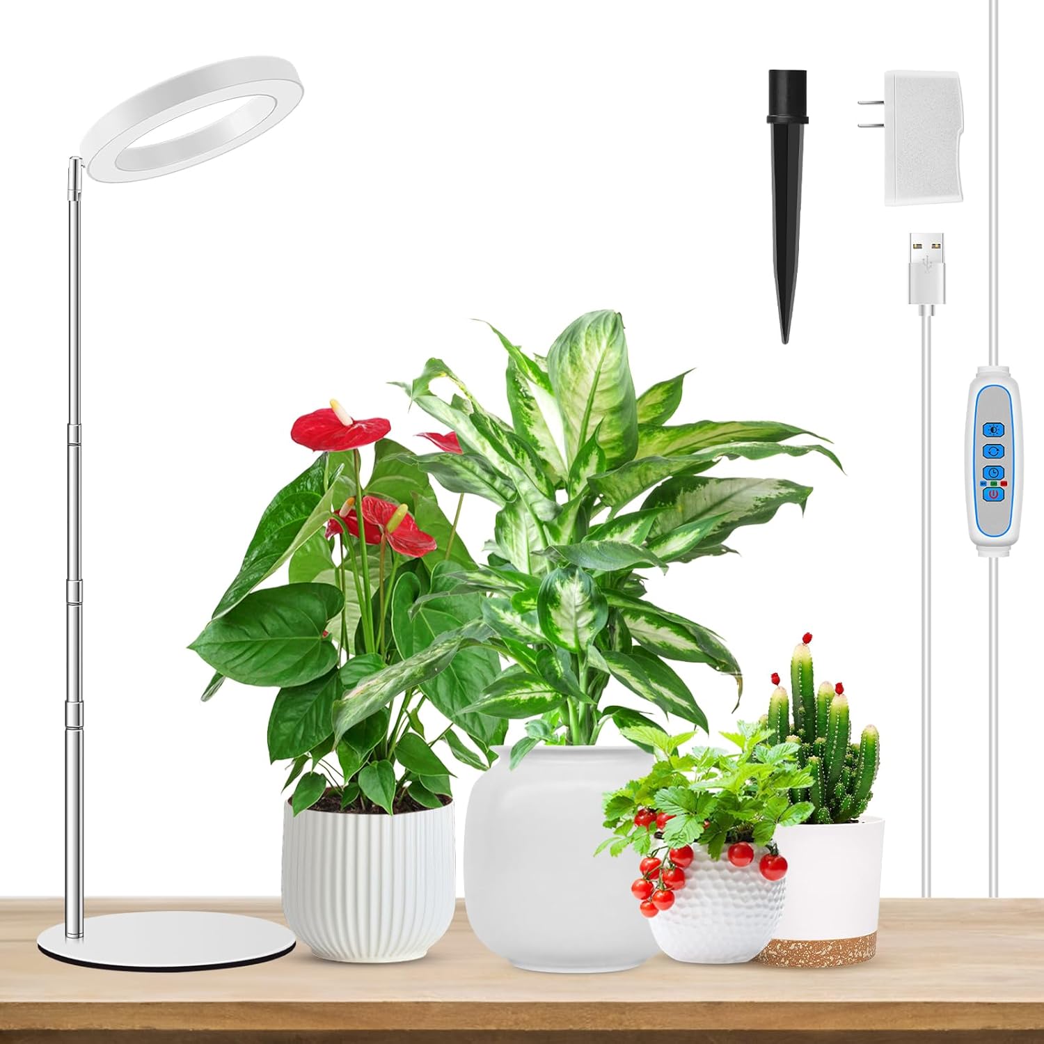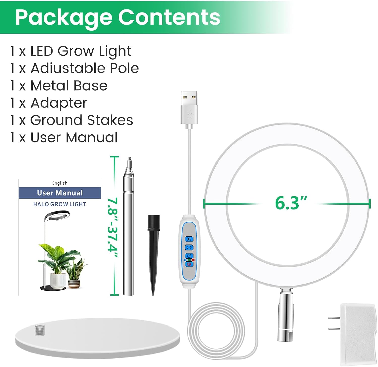 - Two Installation Method: This plant light can be inserted into the soil or placed on the table. 6.3in metal base and non-slip pads to ensure the stability of the table, and is equipped with 9.8 to 37.4in adjustable pole, or inserted ABS sharp to the soil.