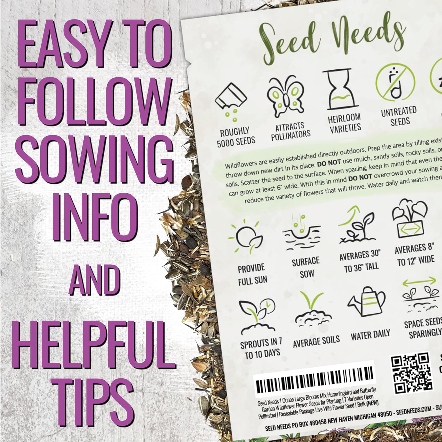 Seed Needs Garden Flower Seeds Large Blooms Mix Hummingbird and Butterfly | 5 Packs (1 Ounce Each) No Filler 7 Varieties Open Pollinated | Resealable Package Live Wild Flower Seed | Bulk