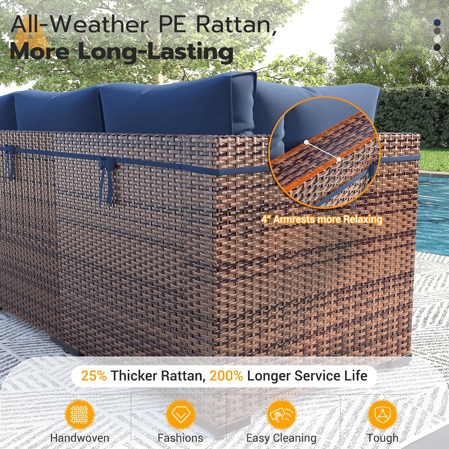 UDPATIO Patio Furniture Set, 5 Piece Outdoor Sectional Modular Sofa with 4'' Thickened Cushions, Wicker Outdoor Furniture Conversation Sets with Waterproof Cover for Deck Backyard(Brown/Navy Blue)
