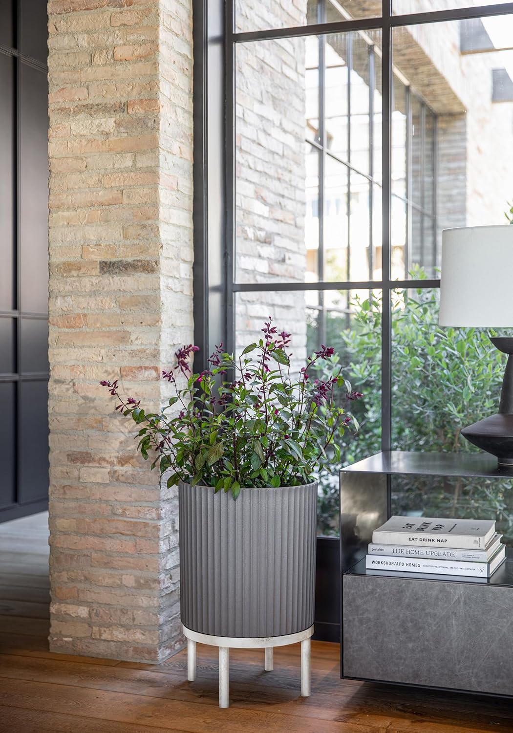Veradek Demi Series Round Planter w/Stand for Porch/Patio | Durable Plastic-Stone Composite & Wooden Stand | Modern Décor for Tall Plants, Flowers