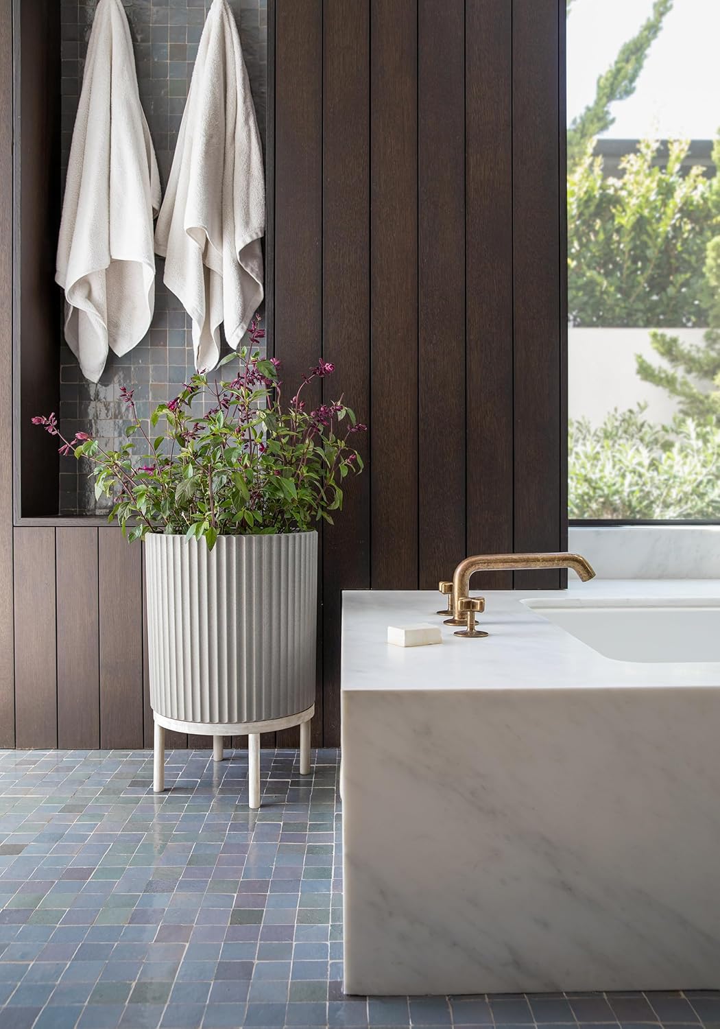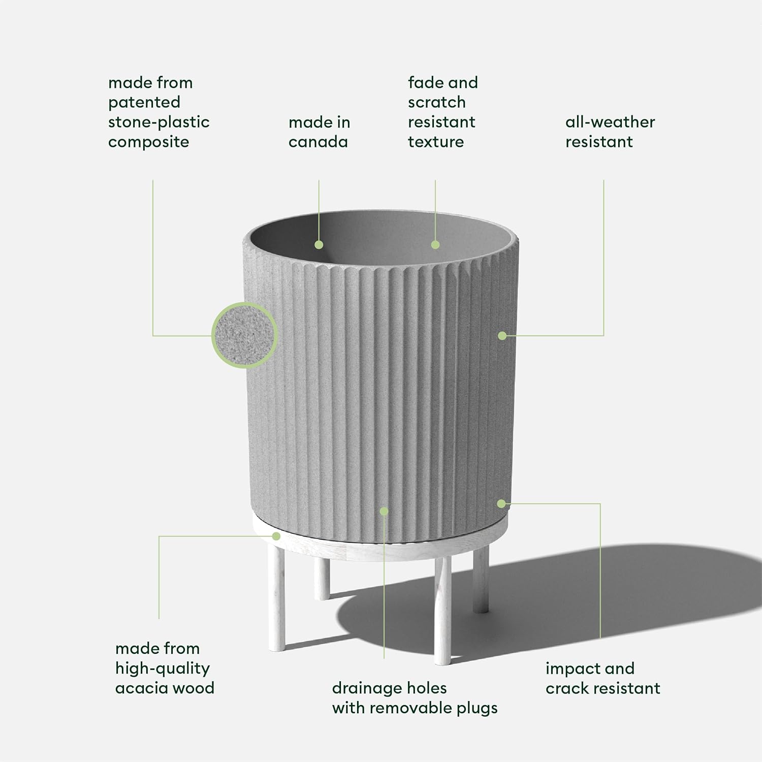 Veradek Demi Series Round Planter w/Stand for Porch/Patio | Durable Plastic-Stone Composite & Wooden Stand | Modern Décor for Tall Plants, Flowers