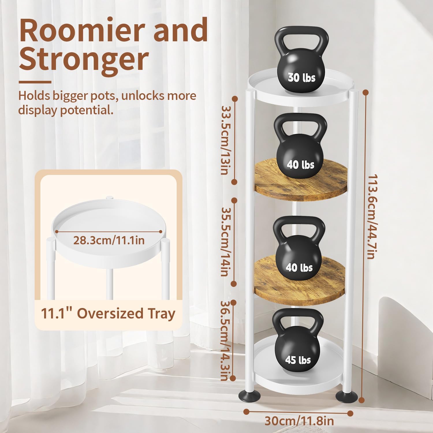 - 【Large Trays for Bigger Plants】Our upgraded 11.1-inch wider trays offer more space than most on the market, giving you plenty of space for larger planters. Each tray can hold over 40 pounds, making it a perfect fit for those hefty cement pots that other plant stands for indoor plants just can't handle.
