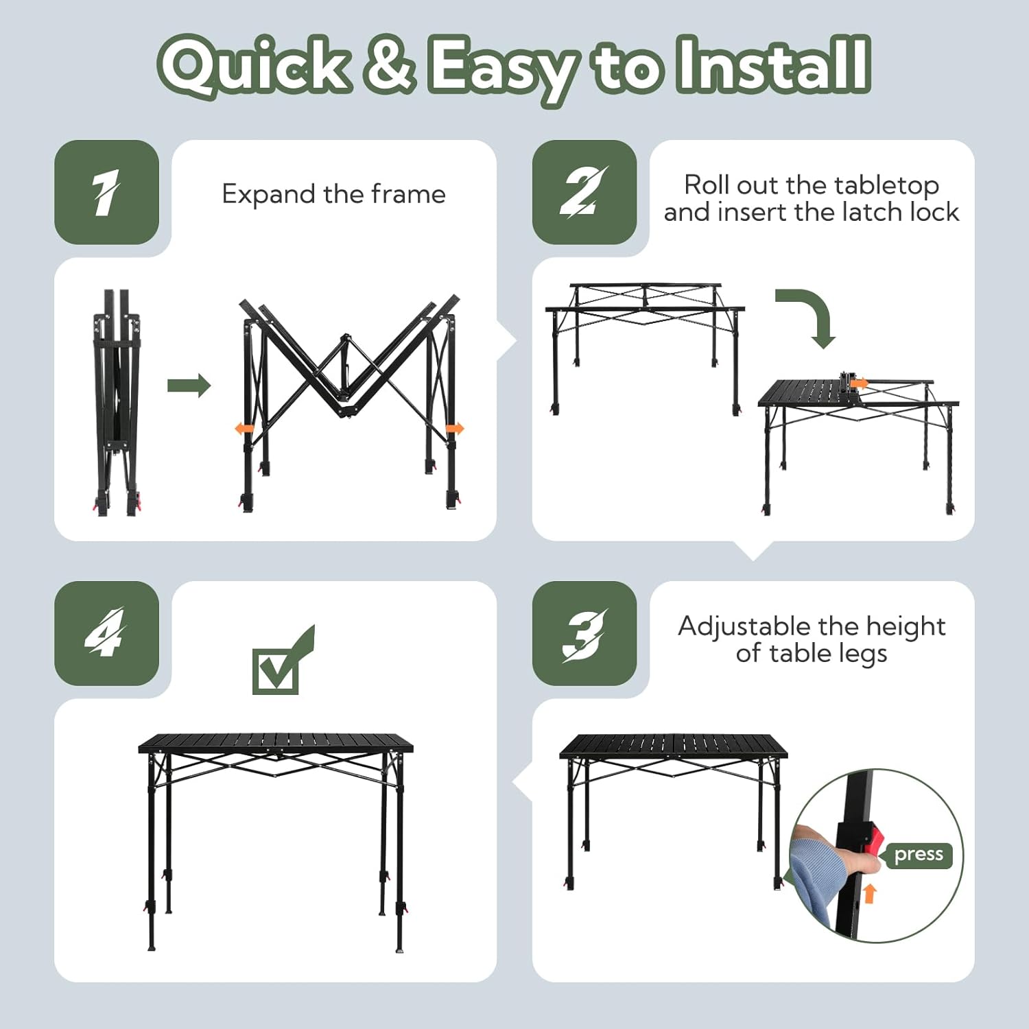 - Portable and Easy to Install: The camping table features a folding design, allowing it to be quickly and easily set up or folded without tools, saving you time and space. The folded size is 33"L x 11"W x 4.7"H. After folding, store it in the carrying bag for convenient outdoor transport and storage; it can easily fit in the back of a car, RV, or motorcycle.