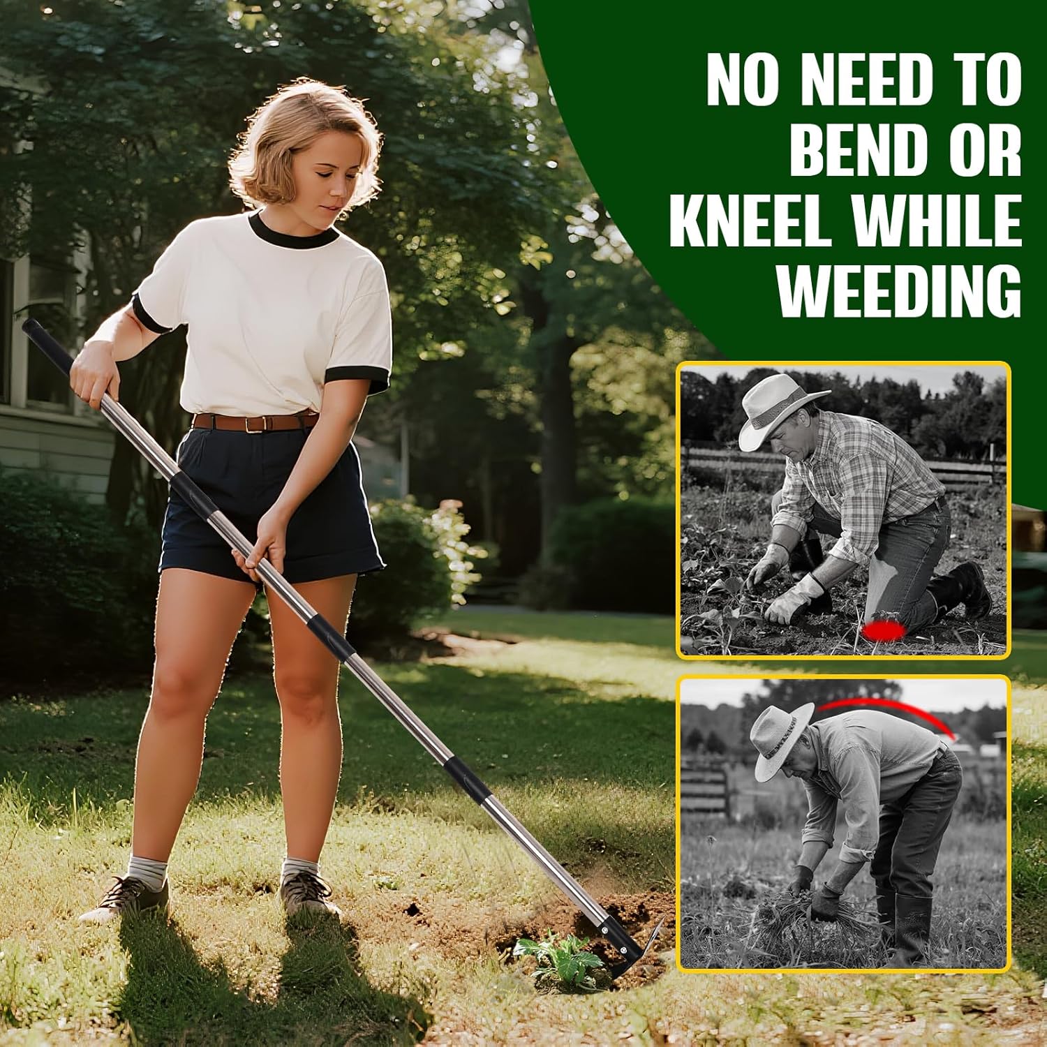 - 【Adjustable Length Saves Your Back】Tackle garden chores standing tall! This hoe features an extra-long, adjustable handle (15.9", 30", 43.8", 58") for comfortable use at any height. Eliminate bending, kneeling, and straining your back and knees. Easily assemble your perfect length.