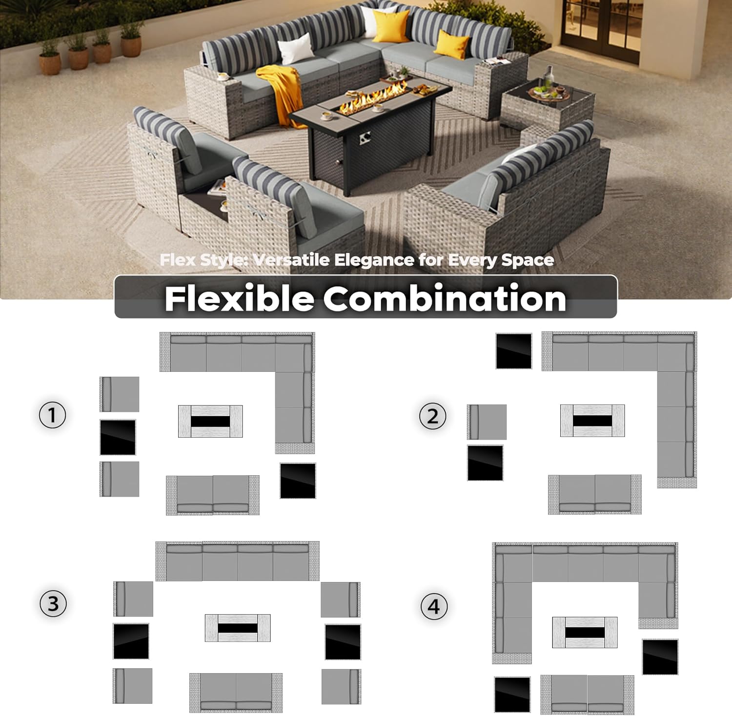 ovios 13 Pieces Patio Furniture Set, Outdoor Wicker Sectional Sofa with 54 Inch Fire Pit Table Comfy Cushions, Modern Modular Deep Seat Rattan Couch Conversation Set, Dark Gray Stripe
