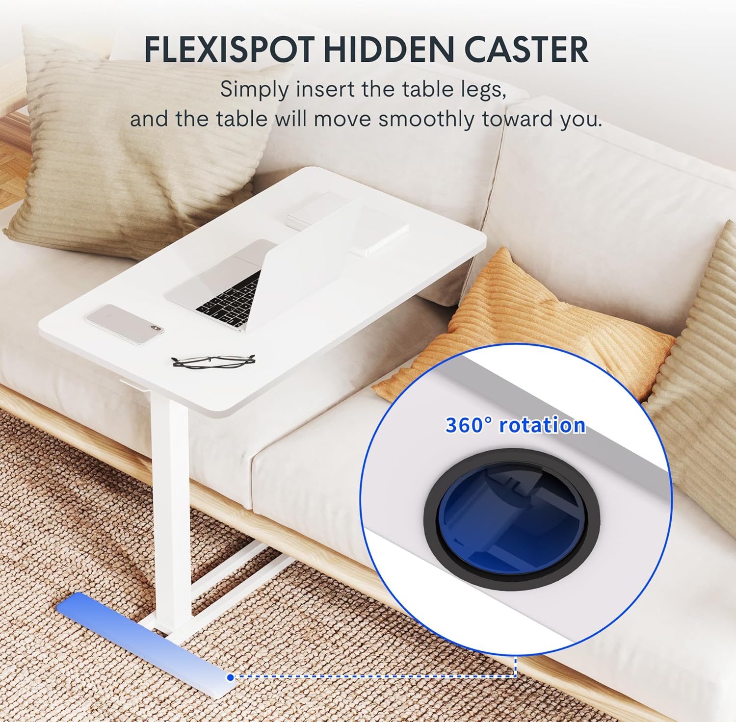 - 360° Smooth-Glide Mobility for Multi-Room Use:Four swivel wheels ensure seamless movement across floors, effortlessly rolling under beds, couches, or recliners as a space-saving over couch table. Transition from a hospital bed table to a living room TV tray or mobile end table with zero friction, ideal for quick room-to-room adjustments.