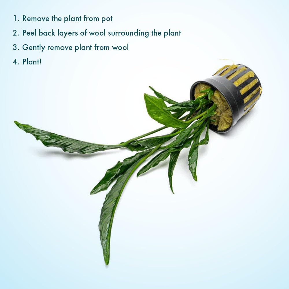 - Sold potted for easy transfer—remove plant from pot and attach to hardscape using glue or string. Do not bury the rhizome to prevent rot.